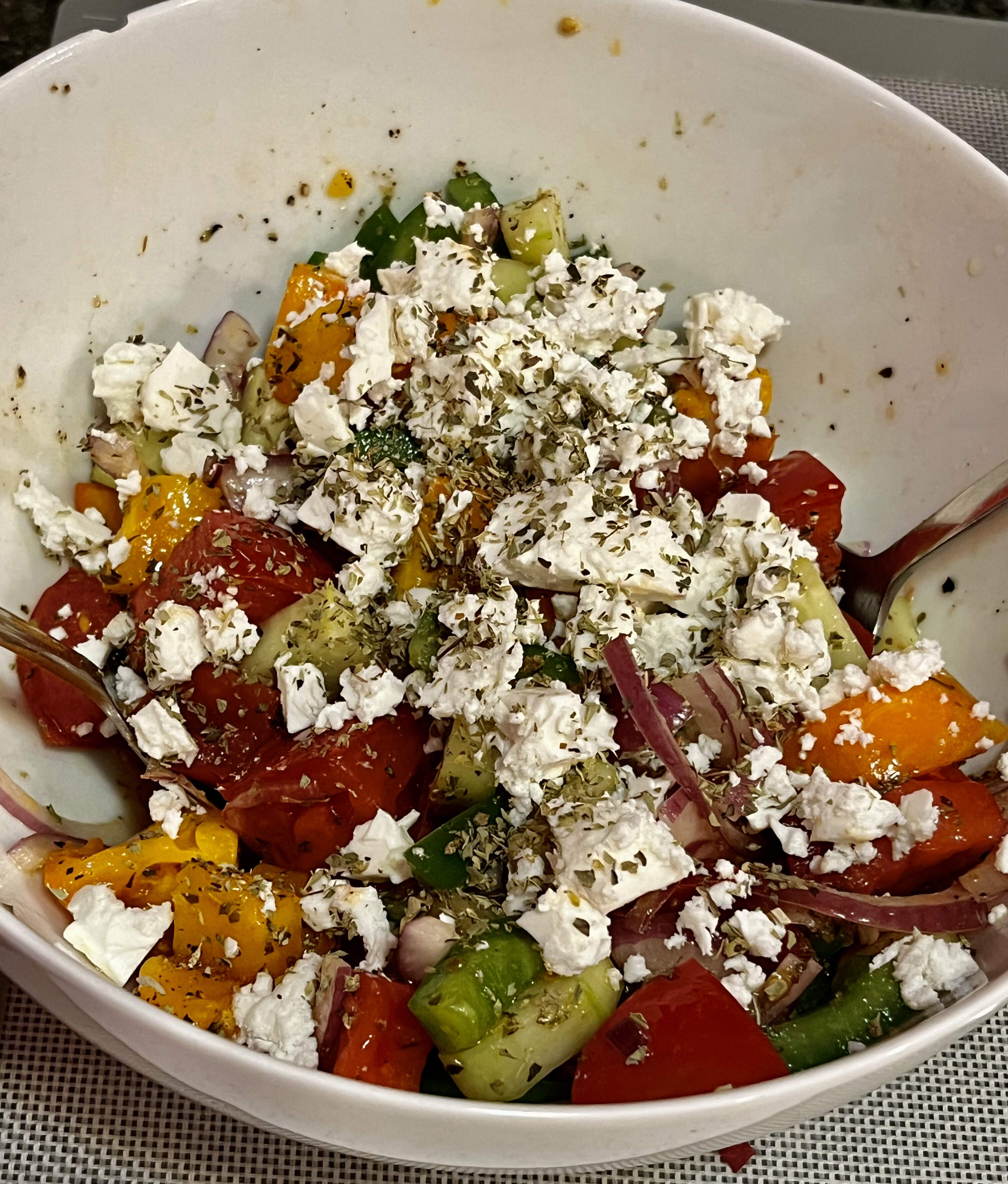It was too late/dark to turn on the grill, so the souvlaki was air-fried — a first at casa lingua. Guess what? Came out quite nicely. Certainly nice enough for two hungry peeps.