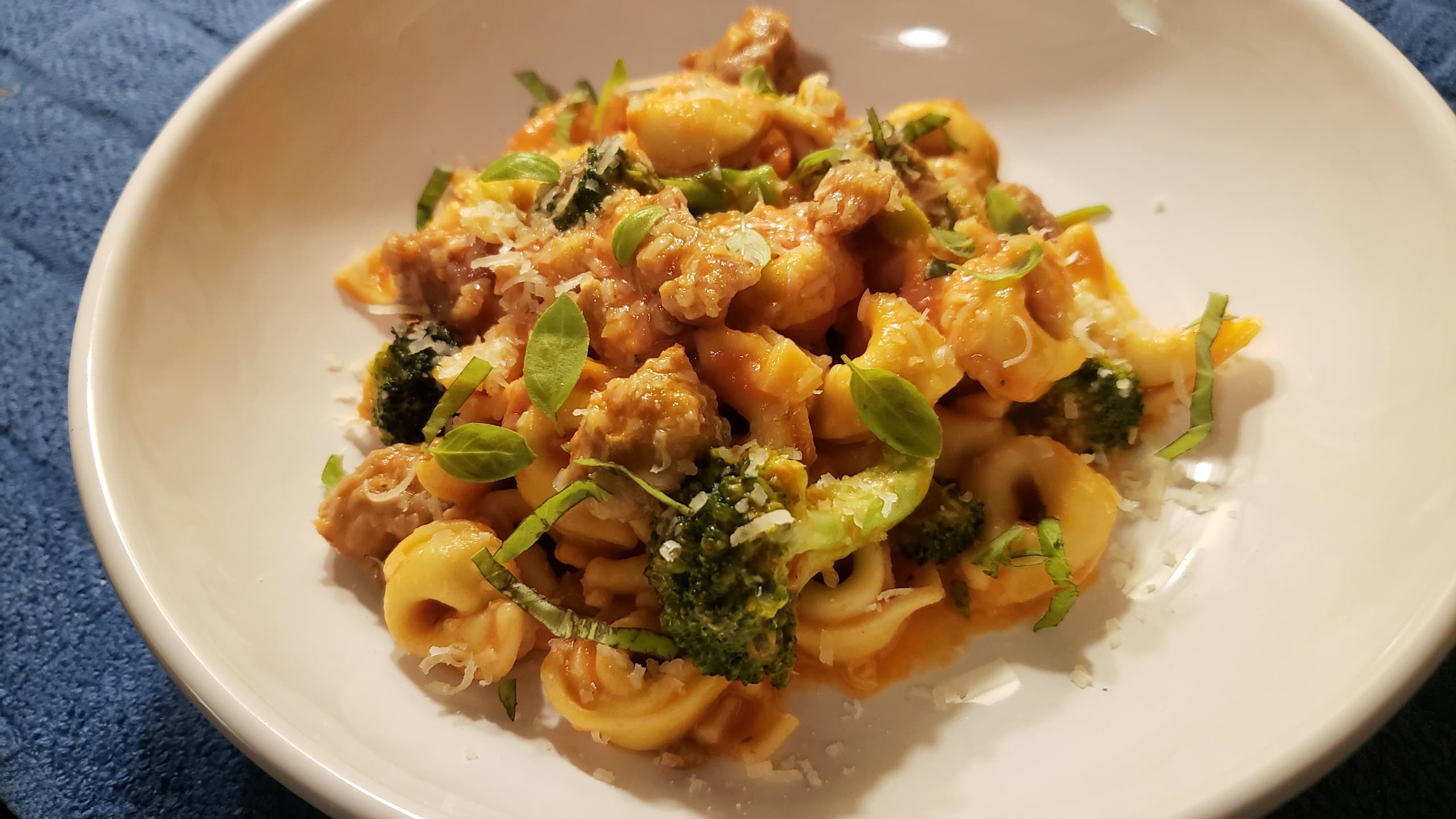 Sautéed sweet Italian sausage squozen from its casing, broccoli florets, minced garlic, a sploosh of wine, 1 cup of fresh tomato sauce I made last weekend, a sploosh of heavy cream, Aleppo pepper, mixed with 4 cheese tortellini, sprinkled with grated Parm-Reg and slivered deck basil.