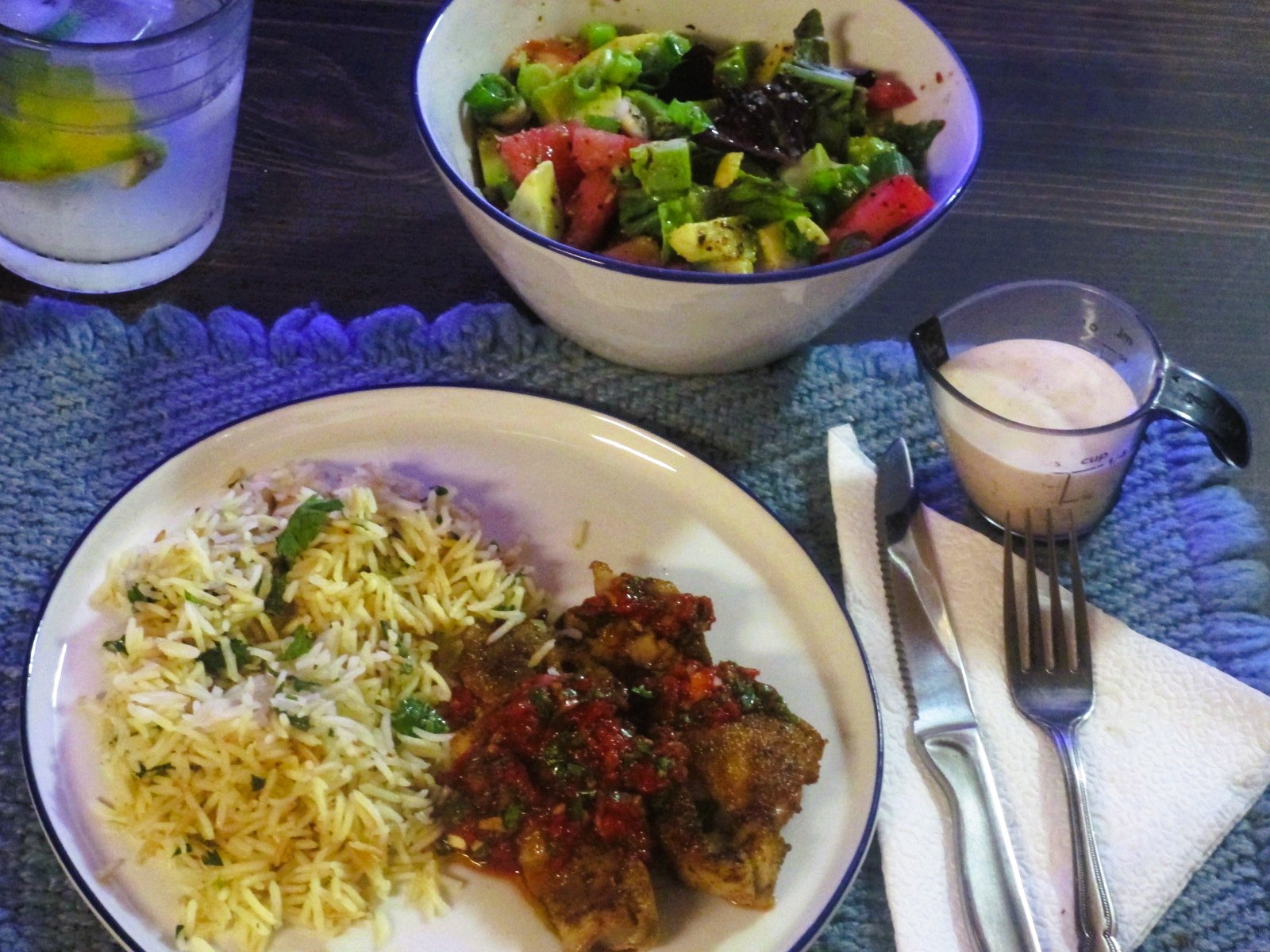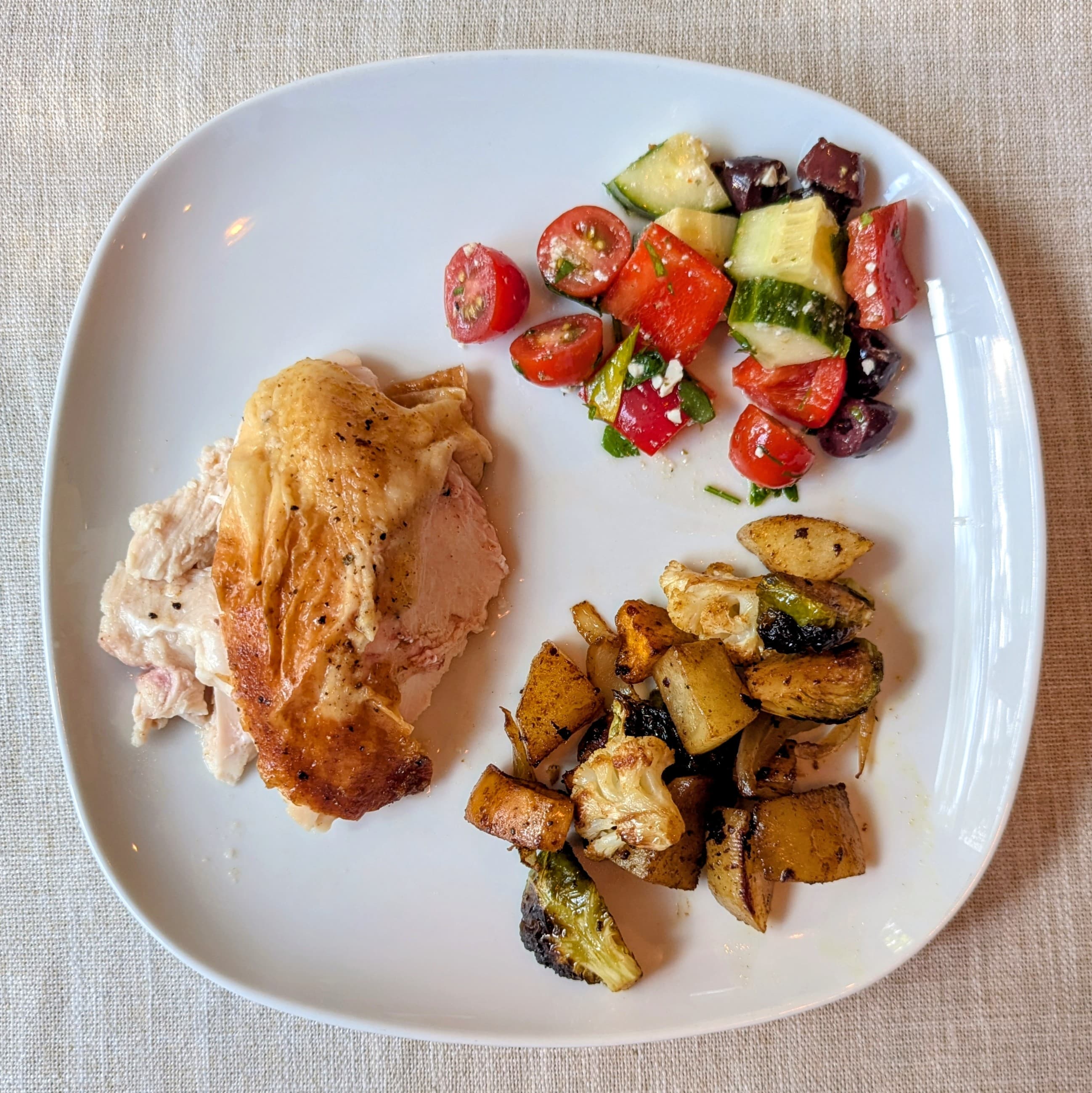 Vertically roasted brined whole chicken, schmaltzy roasted vegetables (sweet and red potatoes, onion, cauliflower, and Brussels sprouts), and a Greekish salad. DH raved after two nights of backpacking dinners.