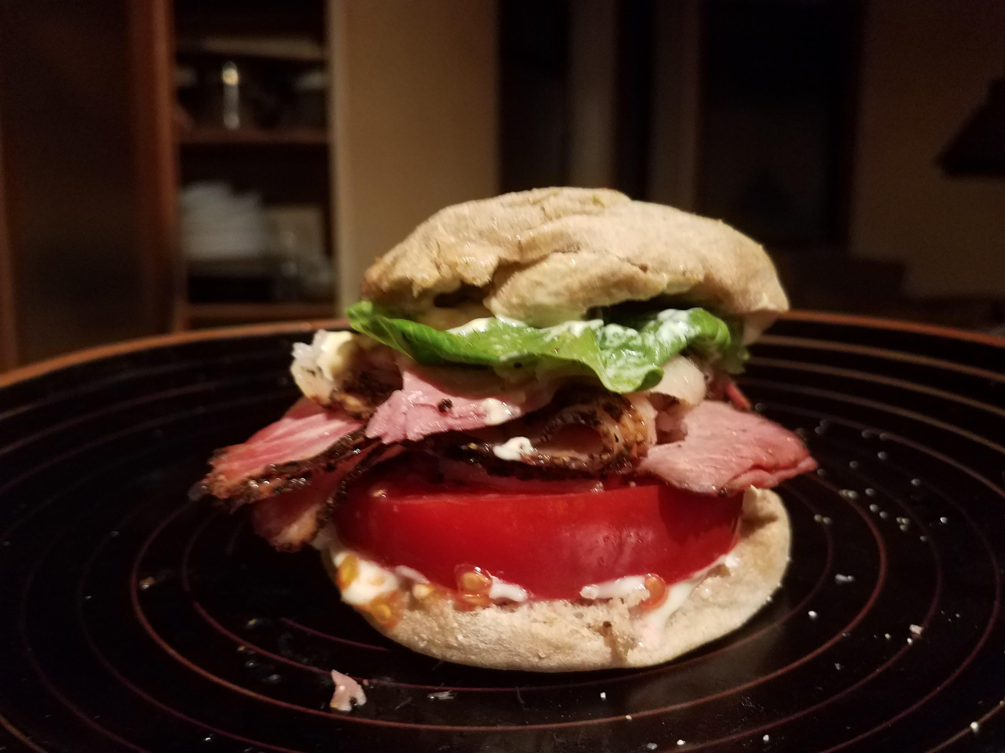 Pastrami, lettuce, and tomato on a ww English muffin. I slathered some ripe d’Affinois on the bottom and some dijonnaise on the top.