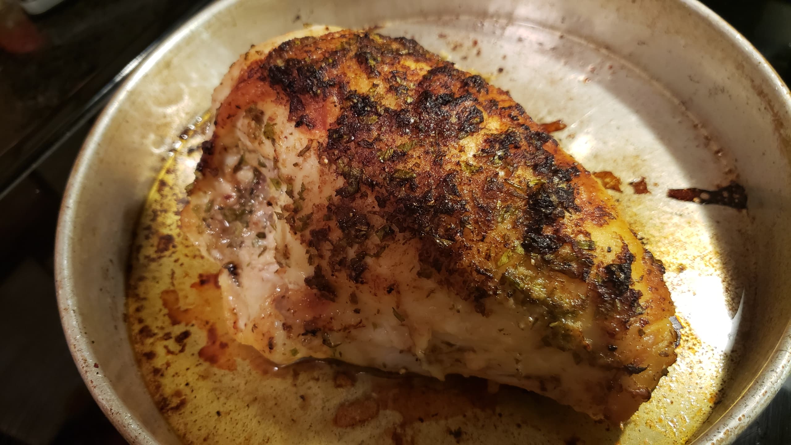 A semi-Sunday roast dinner: a Frankenchicken breast marinated in olive oil, s/p, garlic paste, fresh lemon juice, lemon zest, and freshly minced deck parsley, thyme, and rosemary. Roasted at 425° for 30 minutes, then 375° until done, spooning pan oil over top several times.