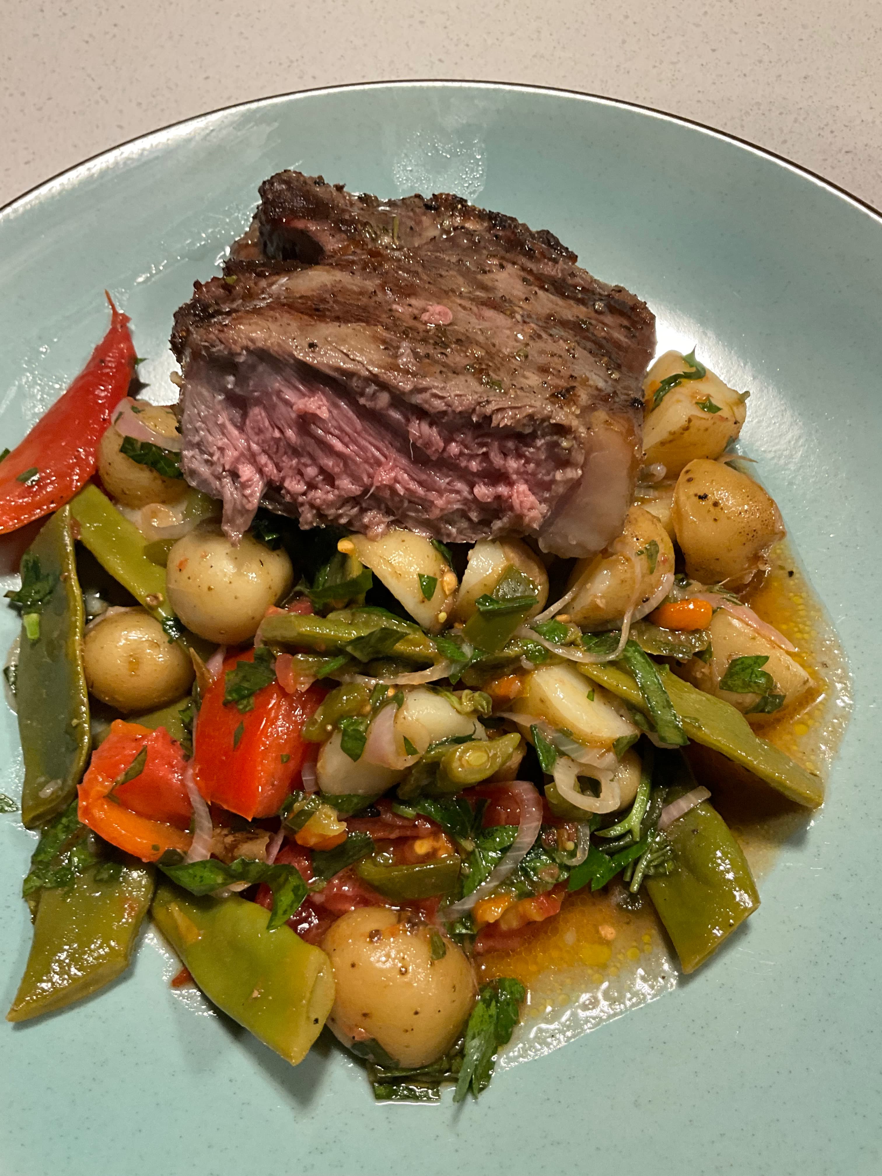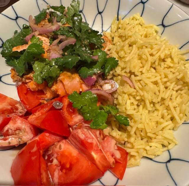 NYT sesame salmon with herbs. Loved the pile of cilantro/quick-pickled shallot/sesame oil on top. I promise there is salmon under the tangle of cilantro salad. Very ripe tomato dressed with sesame dressing and some Knorr’s rice side, which was an impulse buy on-sale at Market Basket (which B and Spring Onion enjoyed).