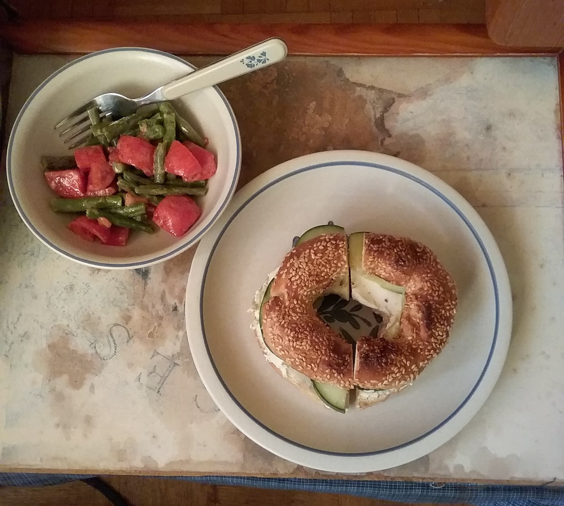 I had the last bagel for dinner last night and discovered I had a little cream cheese left as well as some cukes. I had a tomato green bean salad on the side. I had the last of the butter tarts from the freezer while watching Farm Aid.