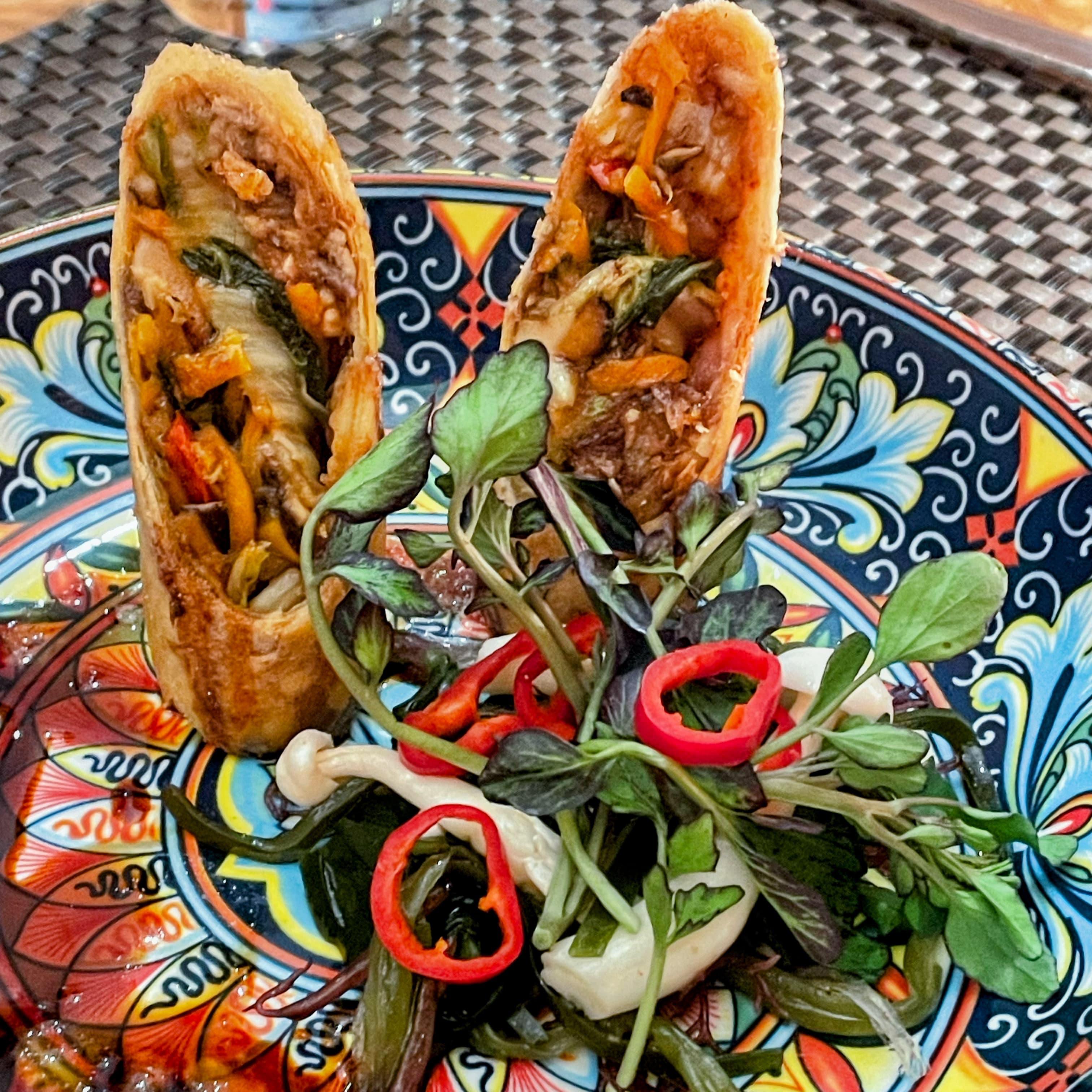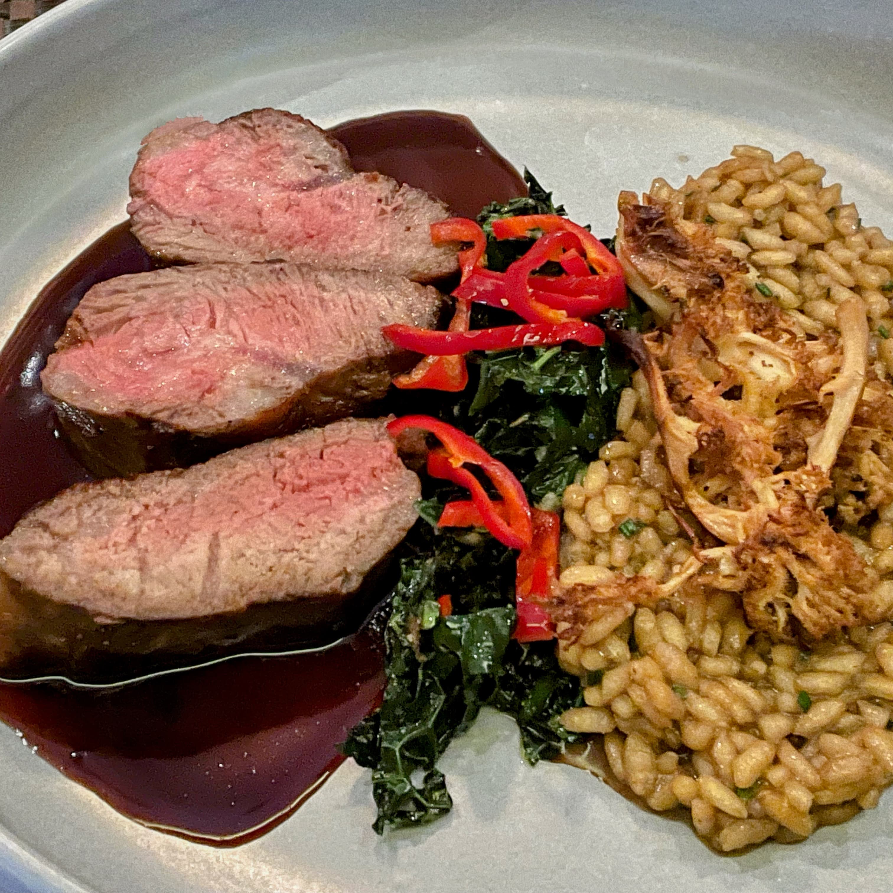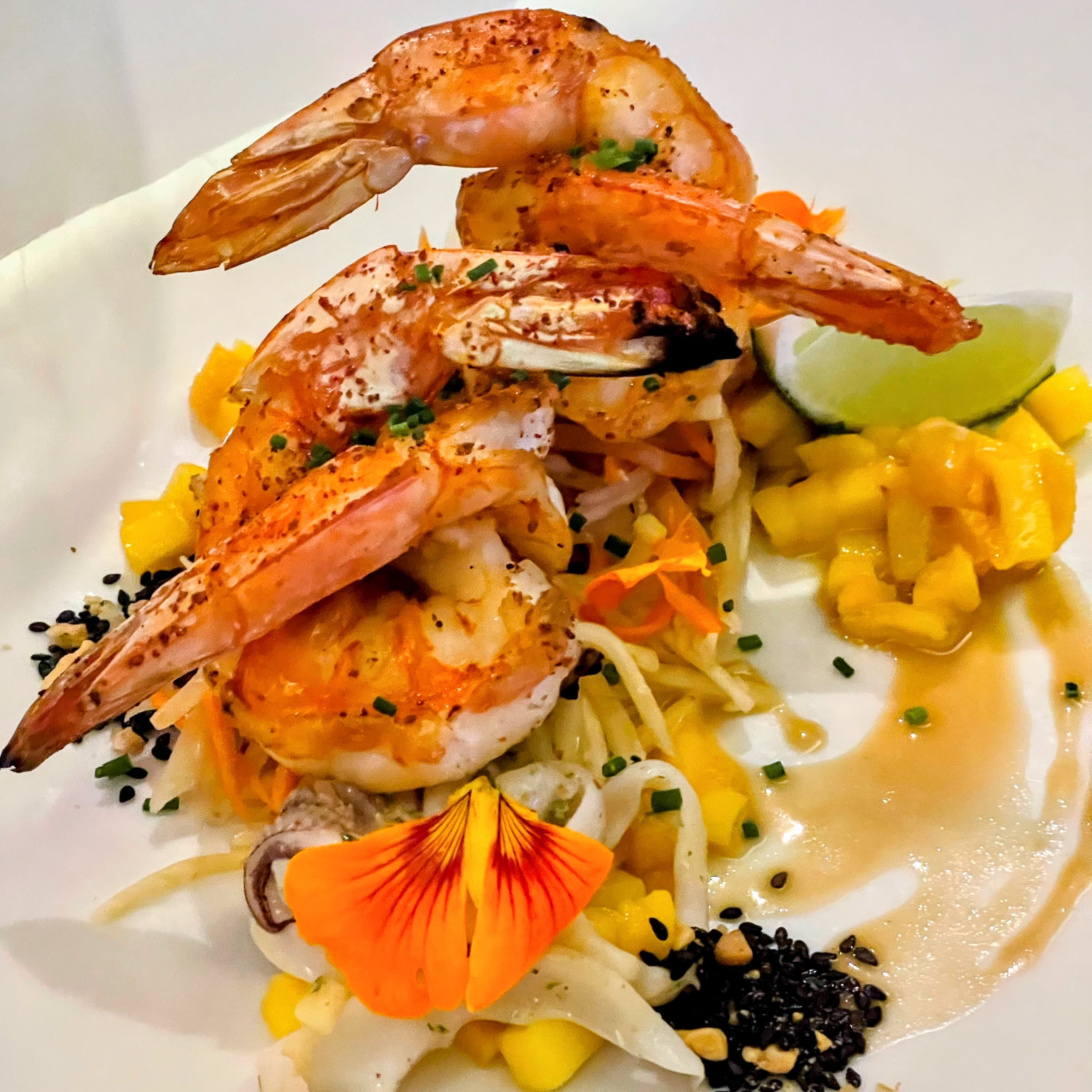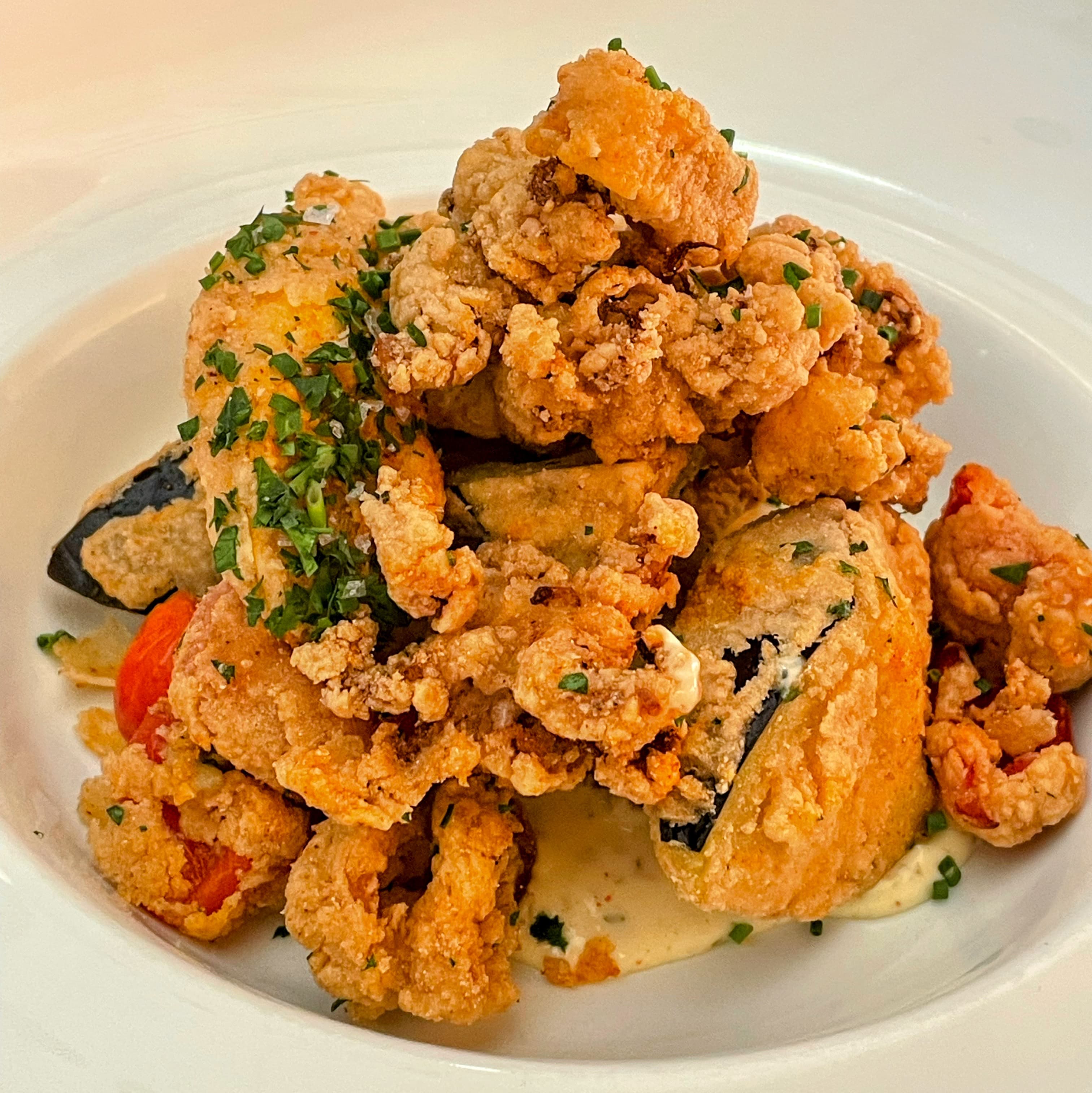 We enjoyed another outstanding dinner at James on Main including tender American Wagyu strip steak with porcini mushroom risotto, bordelaise, dinosaur kale, jimmy nardello peppers; black tiger prawns with thai chili marinated squid, green papaya, mango, micro cilantro, peanut scallion vinaigrette; yellow coconut curry and coral tooth mushroom with toasted pumpkin seeds, roasted japanese eggplant, sticky black rice; duck confit spring roll with pickled hon shimeji mushroom & seaweed salad, smoked lions’s mane mushroom teriyaki hot sauce; frito misto with calamari and various vegetables including eggplant, squash, spicy cherry peppers; wood fired octopus with olives, Piro EVOO, local potatoes, shallots; crispy handcut fries. It all went great with a couple of excellent cabernets.
