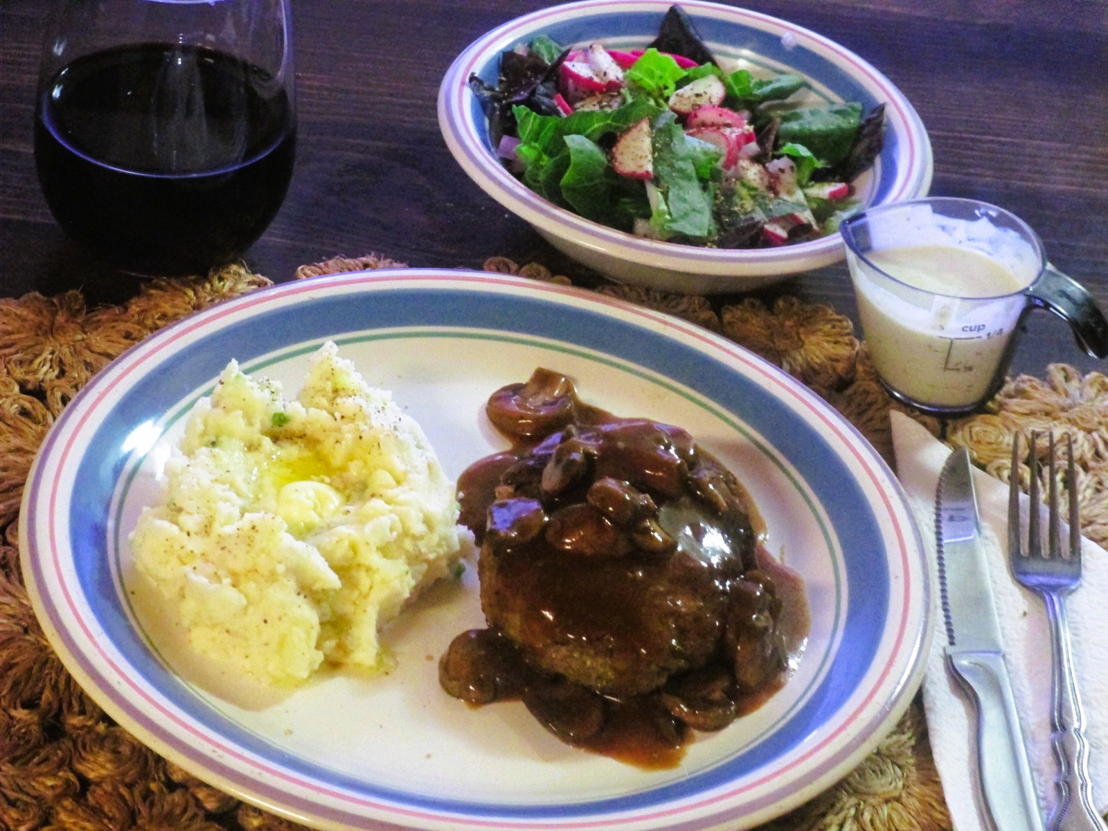 Salisbury steak with mushroom gravy. 50/50 beef & pork, added onion, garlic, parsley and L&P to the panade, gravy was mushrooms sauteed in the drippings, added flour, beef broth and a splash of Maggi. Green onion and sour cream mash, butter. Green and red little gem, red onion, snow peas, radish salad, Green Goddess dressing. Wine.