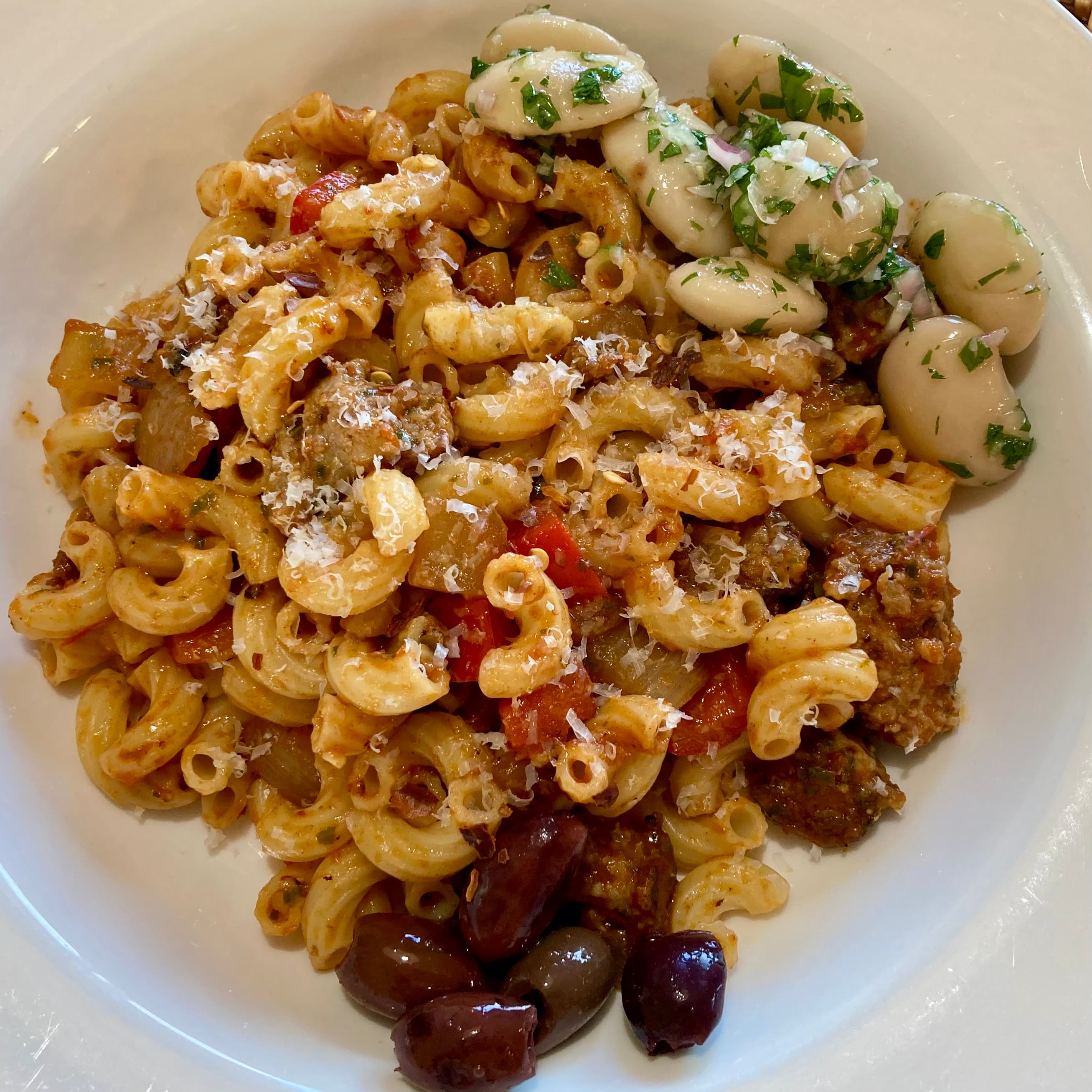 Sauteed Spanish onions and red bell peppers with garlic, Italian sausage, roasted tomatoes, and basil. Tossed with elbow pasta, and served with Tarbias shelling beans and shallots in vinaigrette. Kalamata olives on the side. Grated parm and red pepper flakes for passing. No leftovers.