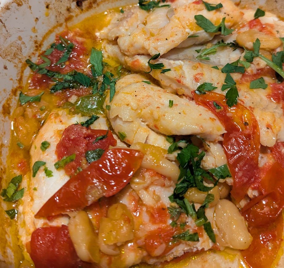 thought id play Melissa Clark or whatever riff and do a simple oven bake for my lovely fresh fish share - fluke aka summer flounder. I cut up some campari tomatoes and put them in an oven casserole with nice olive oil, half a can of cannellini beans (a refrig leftover) and some thyme sprigs. After 15 minutes of roasting at 425F I mixed in the skinny fluke filets, turning them over with a spatula with the bean and tomato mixture and adding some more fresh thyme oil and a couple of sliced up garlic cloves Cooked for another 10 min removed from the oven, sprinkled with parsley and served, The combo was great - only a little white wine might have improved.
