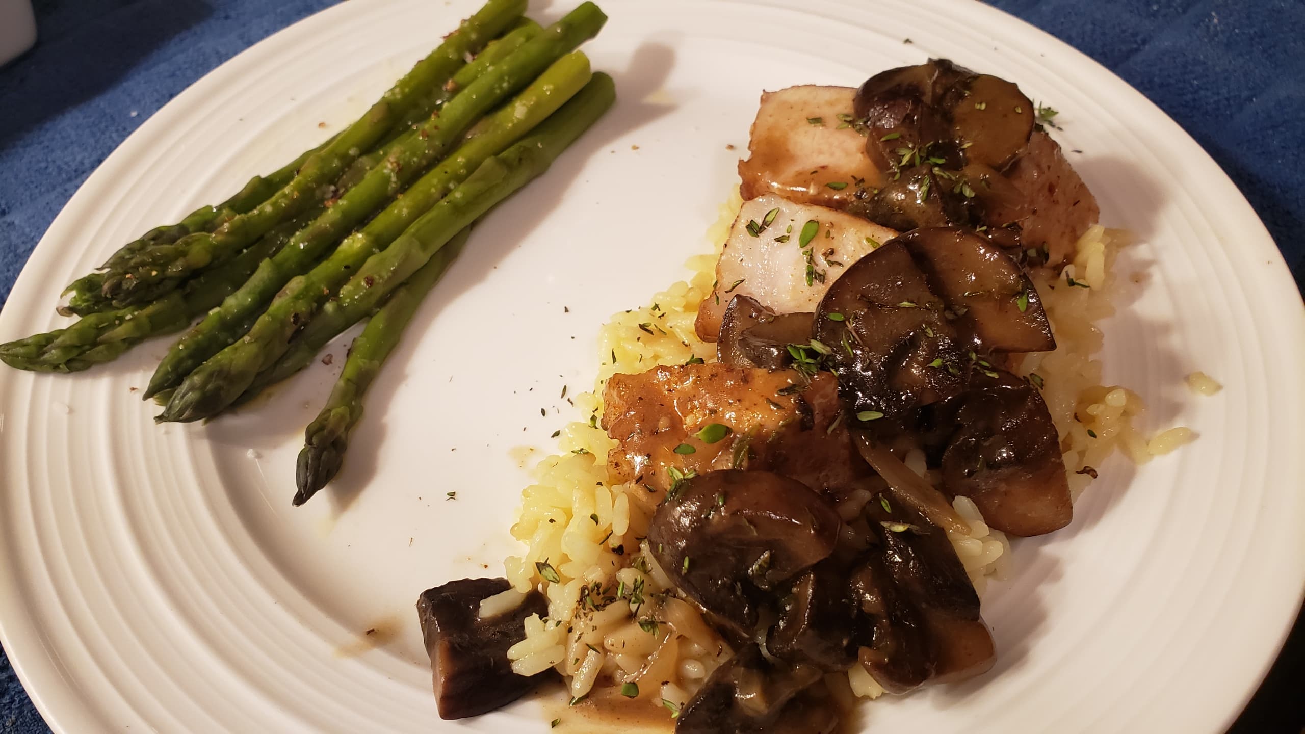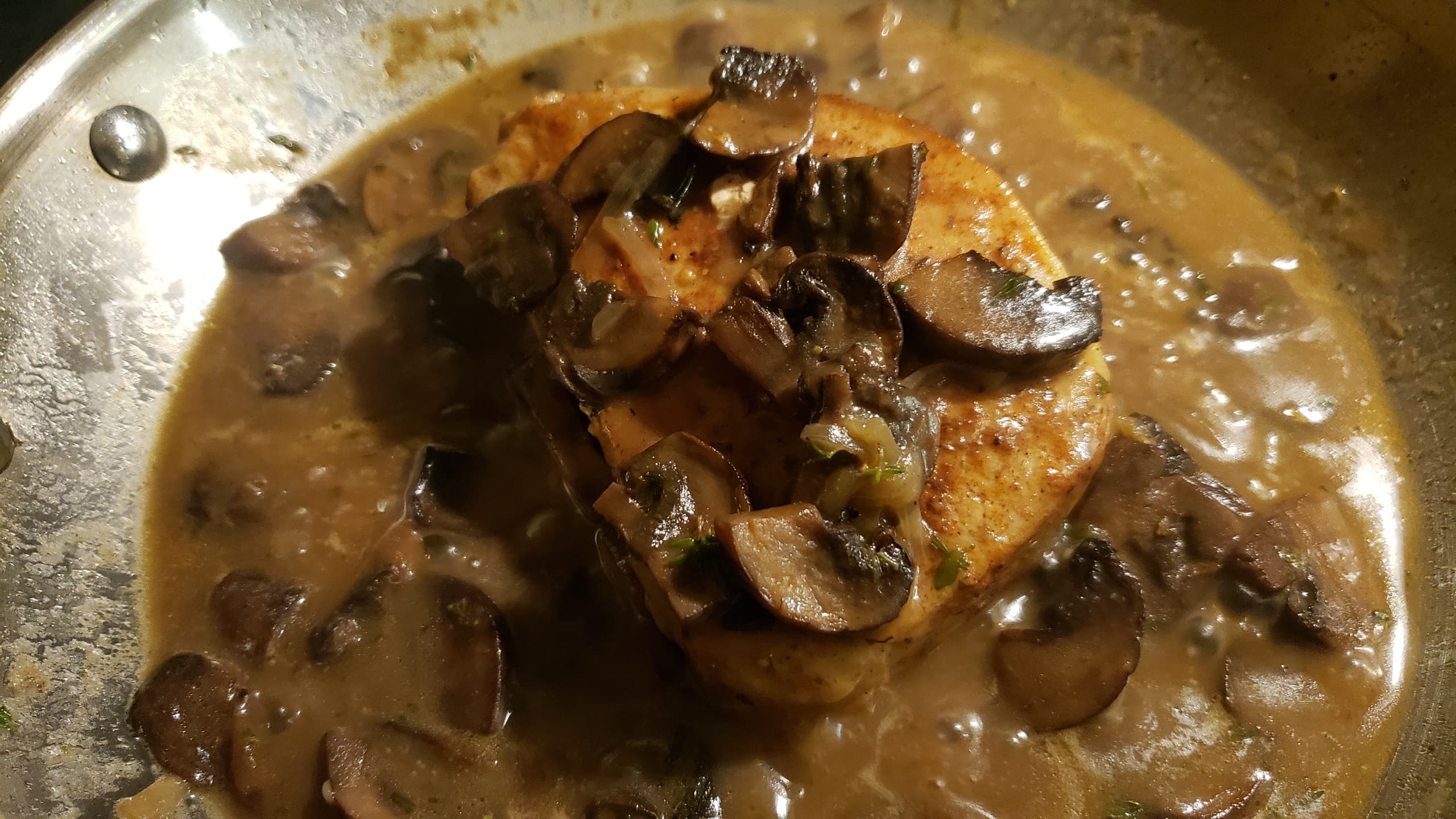 Sautéed more, then added 2 tsp roasted garlic, 1 tsp Dijon mustard and 1/2 tsp freshly minced thyme. Stirred it all in. Added just under 1 cup of mushroom stock (from a half cube) and let it simmer and reduce, adding a flour slurry to slightly thicken the sauce. Put the chop back in, covered. And finished cooking.