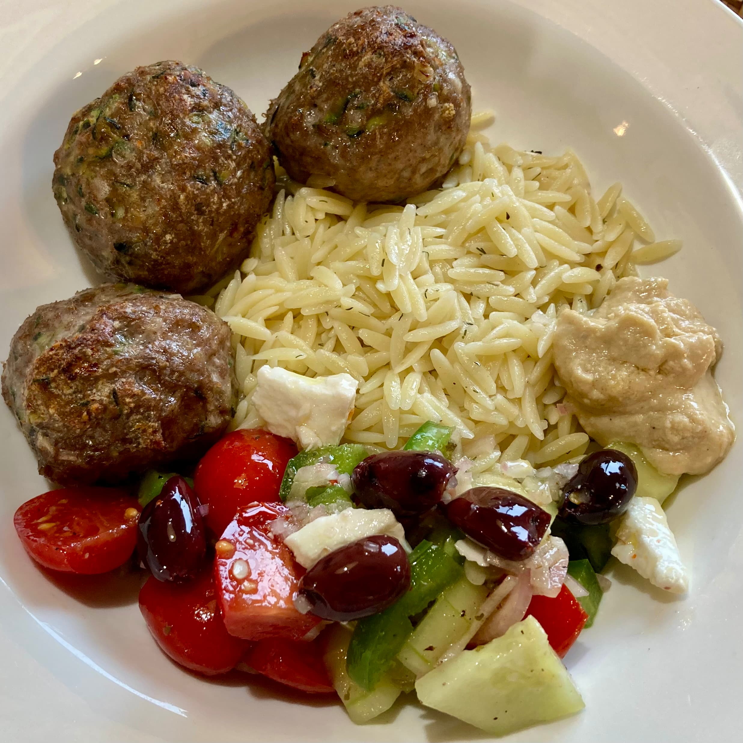 Spiced lamb kofte with zucchini and shallots. Orzo with olive oil, lemon, and dill. Greek salad. Marinated olives and feta. Hummus.