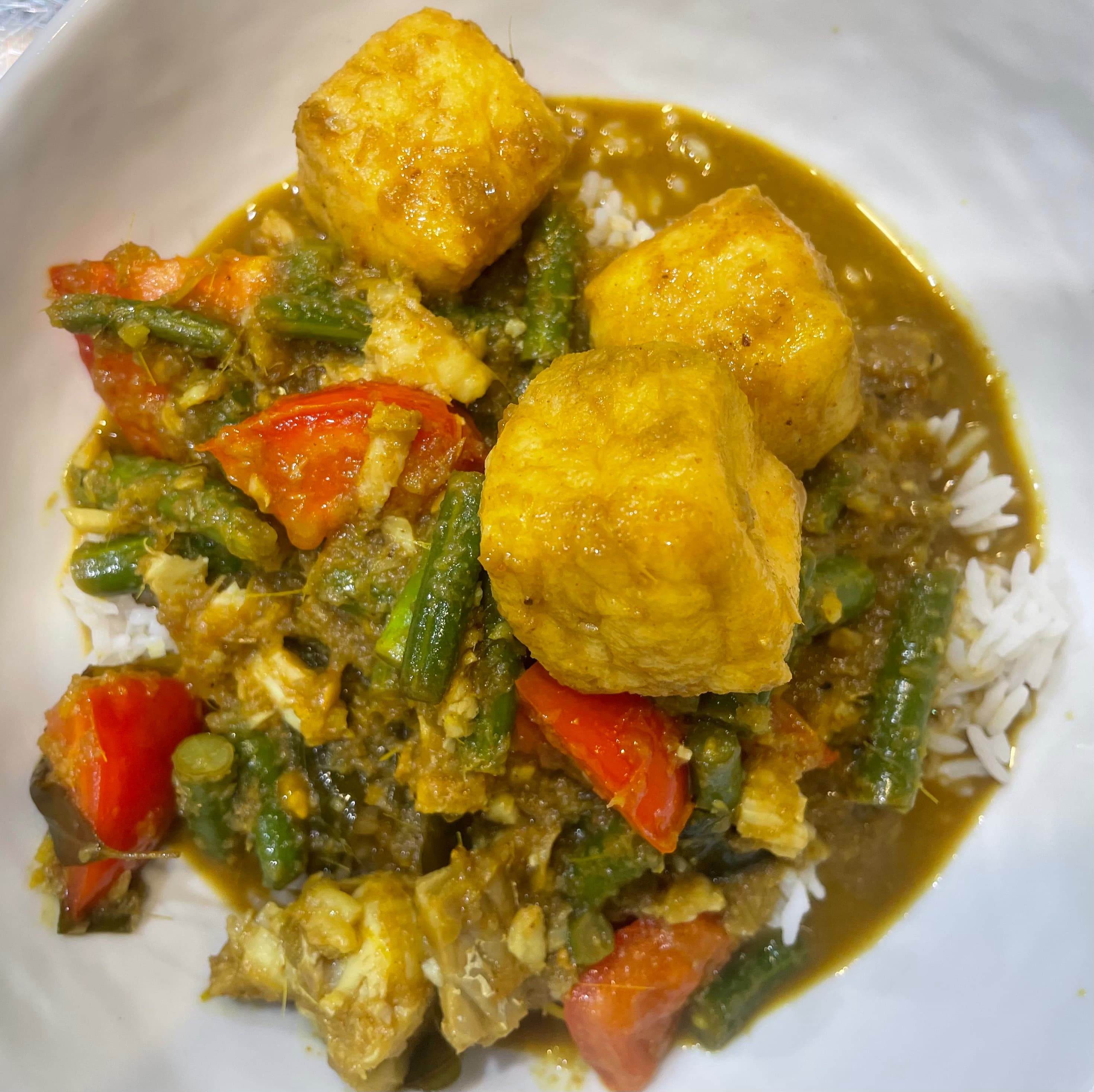 Malaysian Fish Curry from “The Curry Guy One Pot” by Toombs - the base is build by pureeing shallots, garlic, galangal, ginger, lemon grass, jalapeno and shrimp paste. This base gets cooked with star anise, cinnamon stick, curry powder, tamarind paste, curry and makrut leaves, sugar, water and coconut milk. You subsequently add green beans, tofu puffs, cod and tomatoes. Served over rice