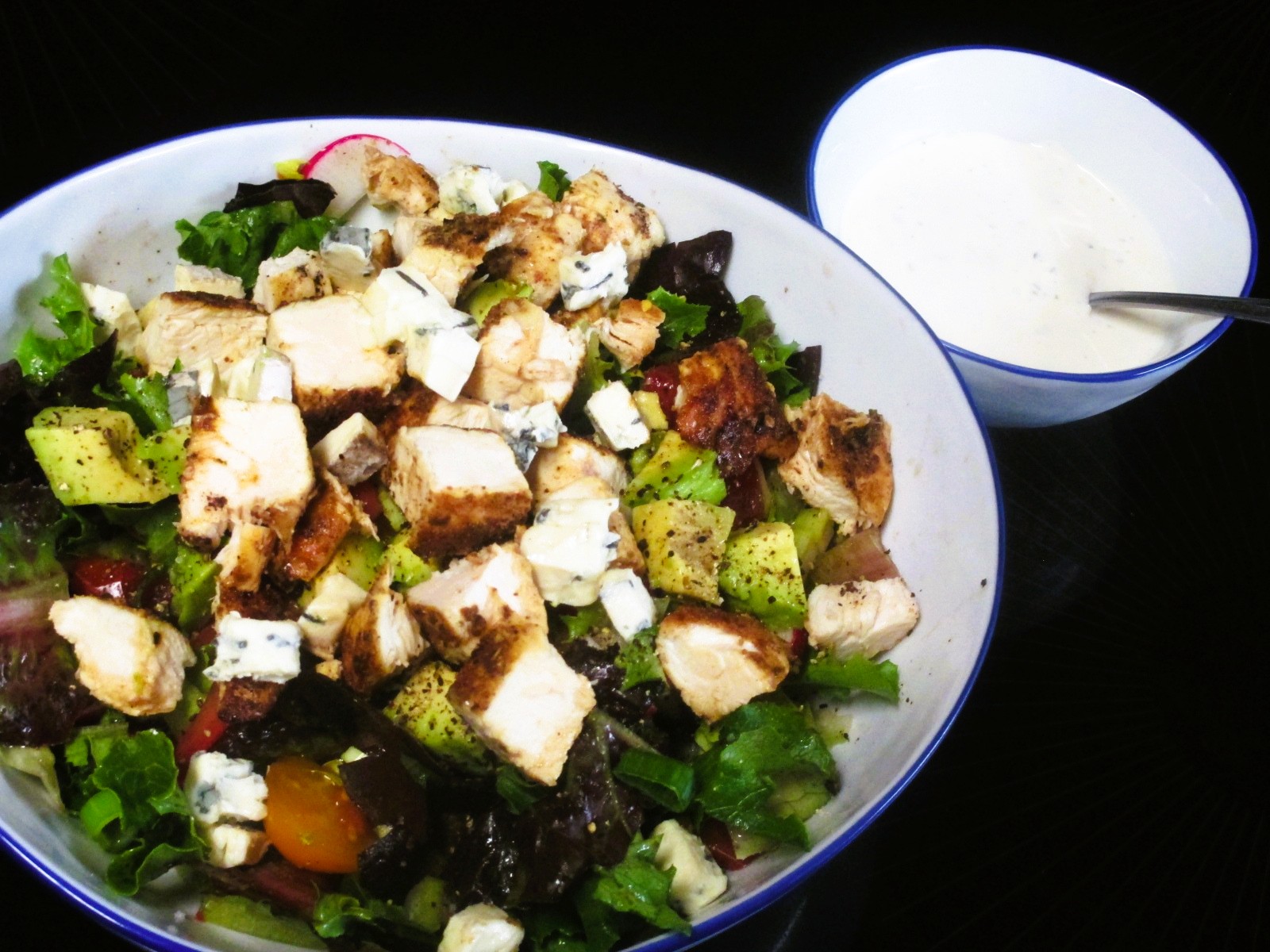 Chicken salad, seasoned and sauteed blsl breast cutlet, mixed greens, green onion, celery, red and gold tomatoes from the garden, avocado, cambozola and ranch.