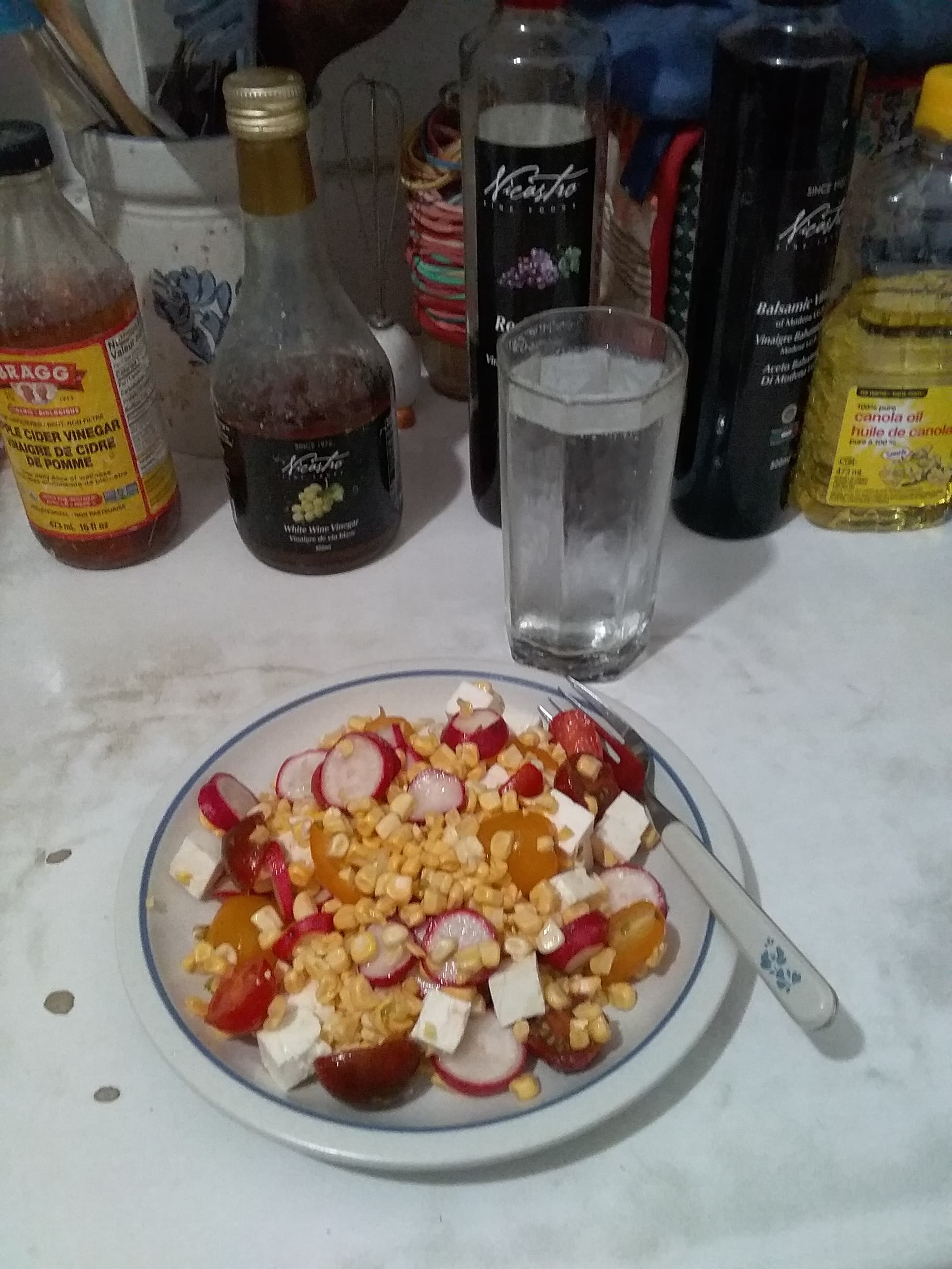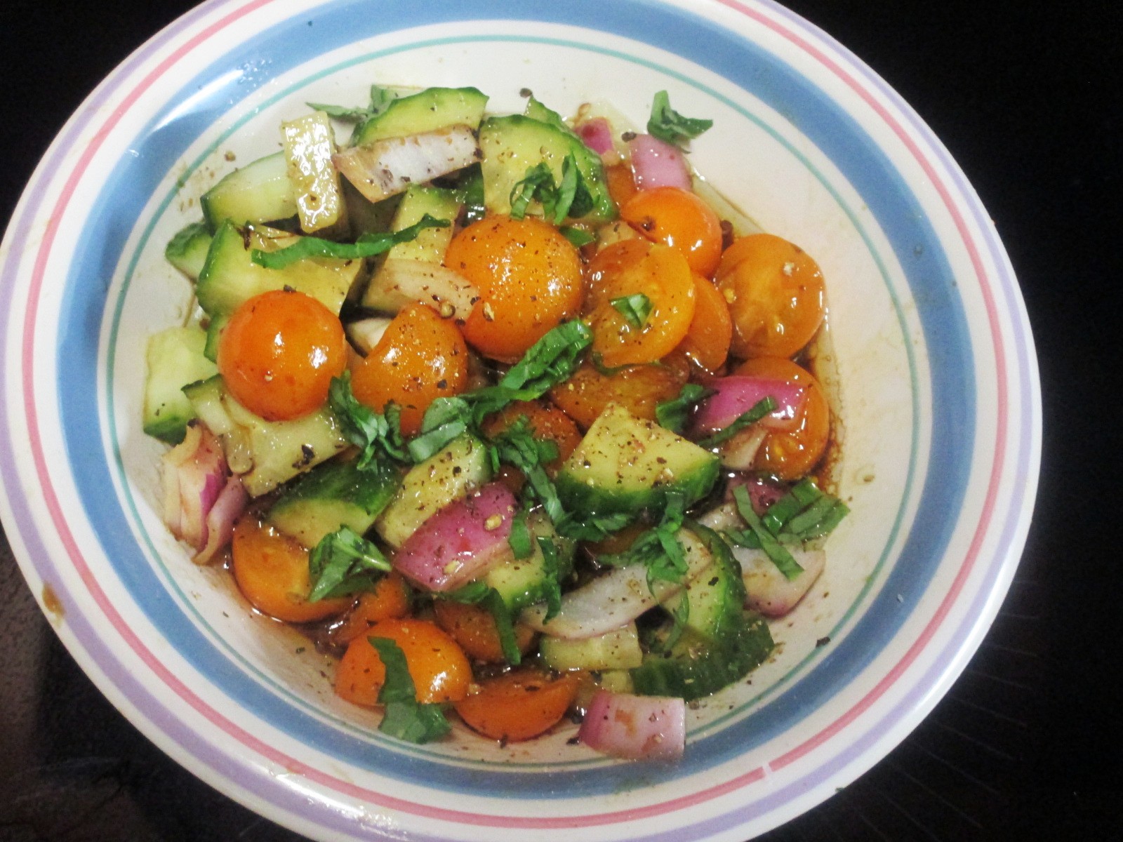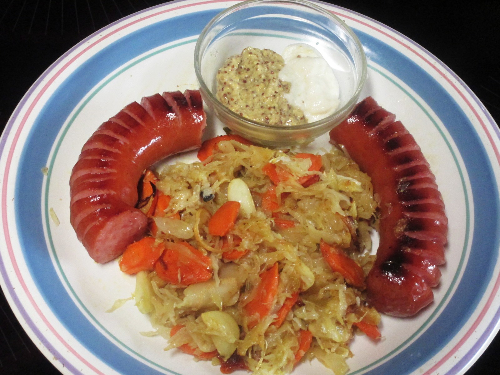 Kielbasa, sauerkraut with onion, garlic and carrots, mustard and horseradish. Cherry tomatoes, cucumber, red onion salad, oo & v dressing, basil.