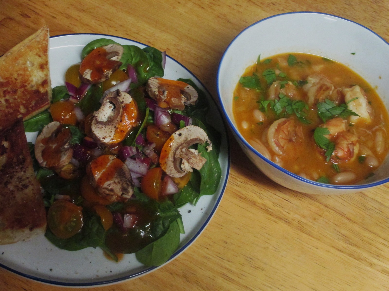Lemony Shrimp and Bean Stew, spinach salad, red onion, tomatoes, mushrooms, sweet and spicy dressing.