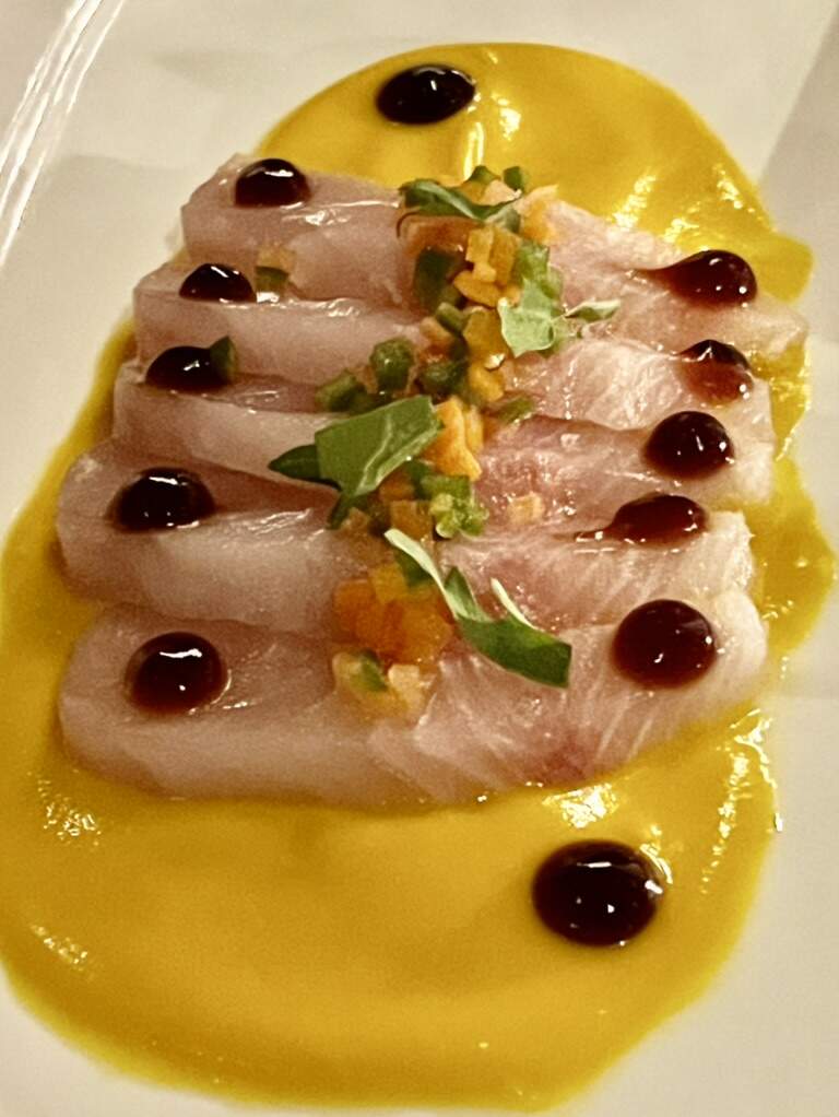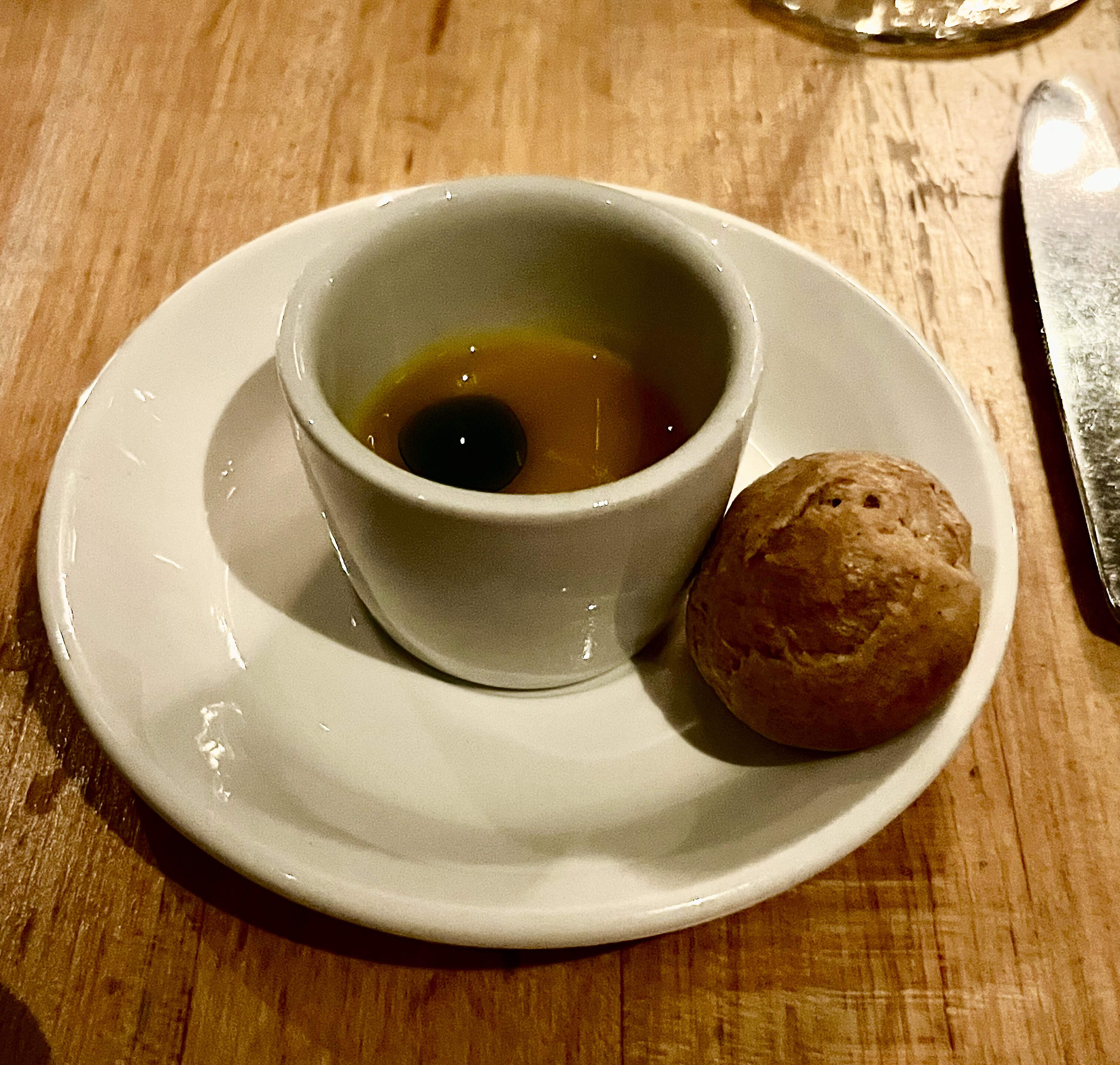 I had a dry AF Ford’s martini, my PIC their excellent Manhattan. The greeting from the kitchen was a butternut squash soup with thyme oil and a gougères. Their soups are always wonderful, even those I least prefer — i.e. winter squash or carrot.