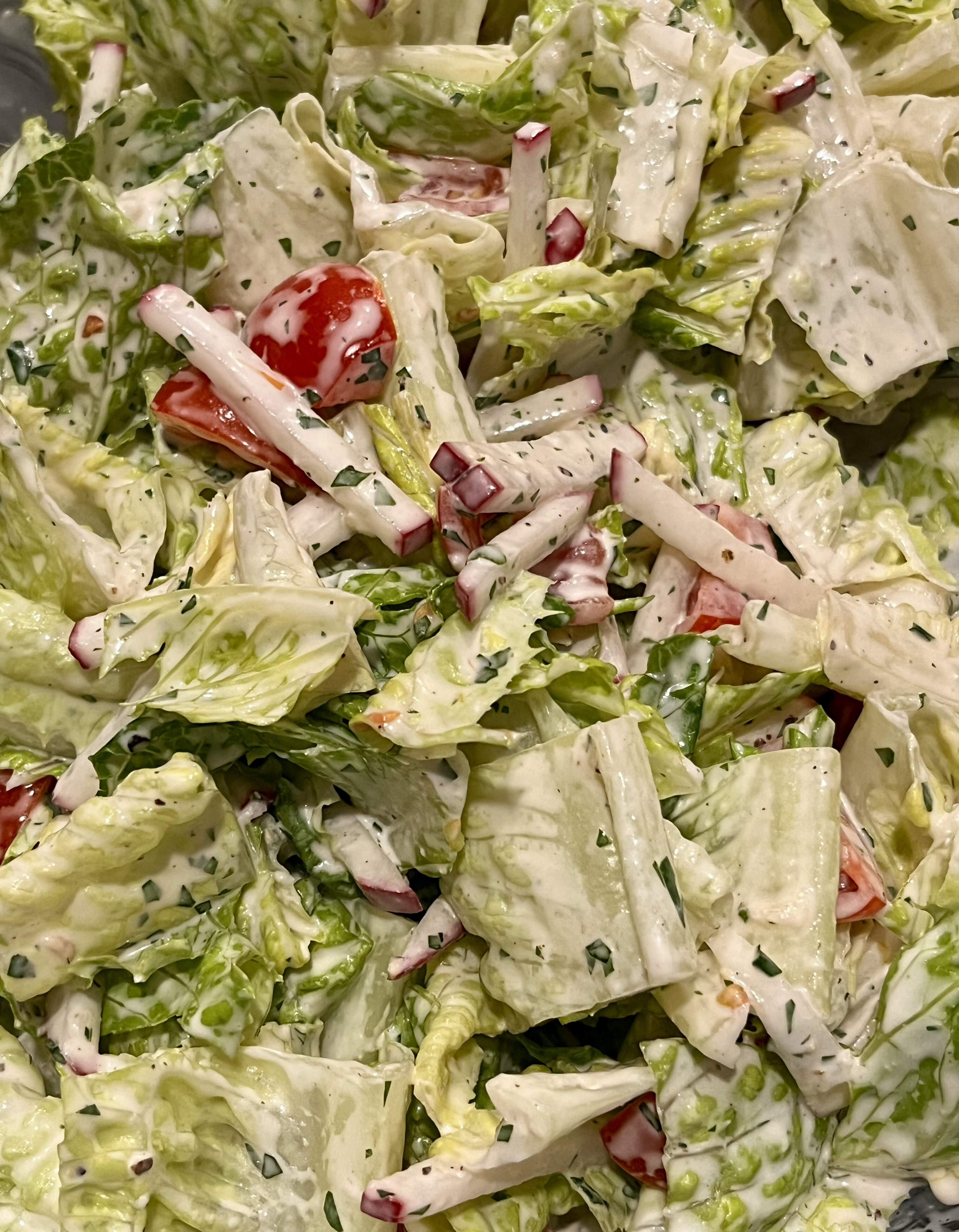 I contributed a lazy Caesar with romaine, flavor bomb tomatoes, radish, Ken’s Caesar dressing, extra lemon juice, extra parm, extra garlic, chopped fresh parsley.