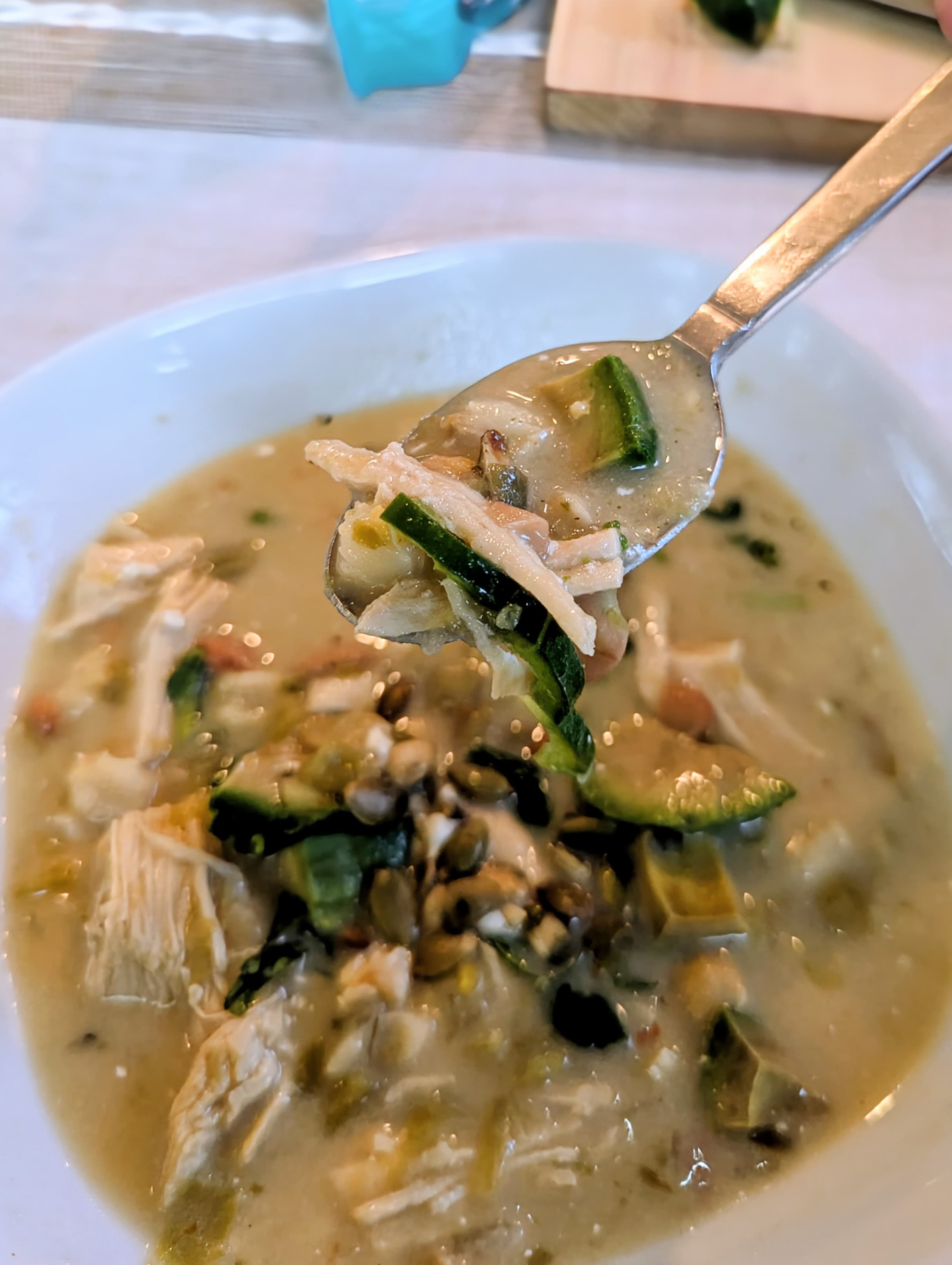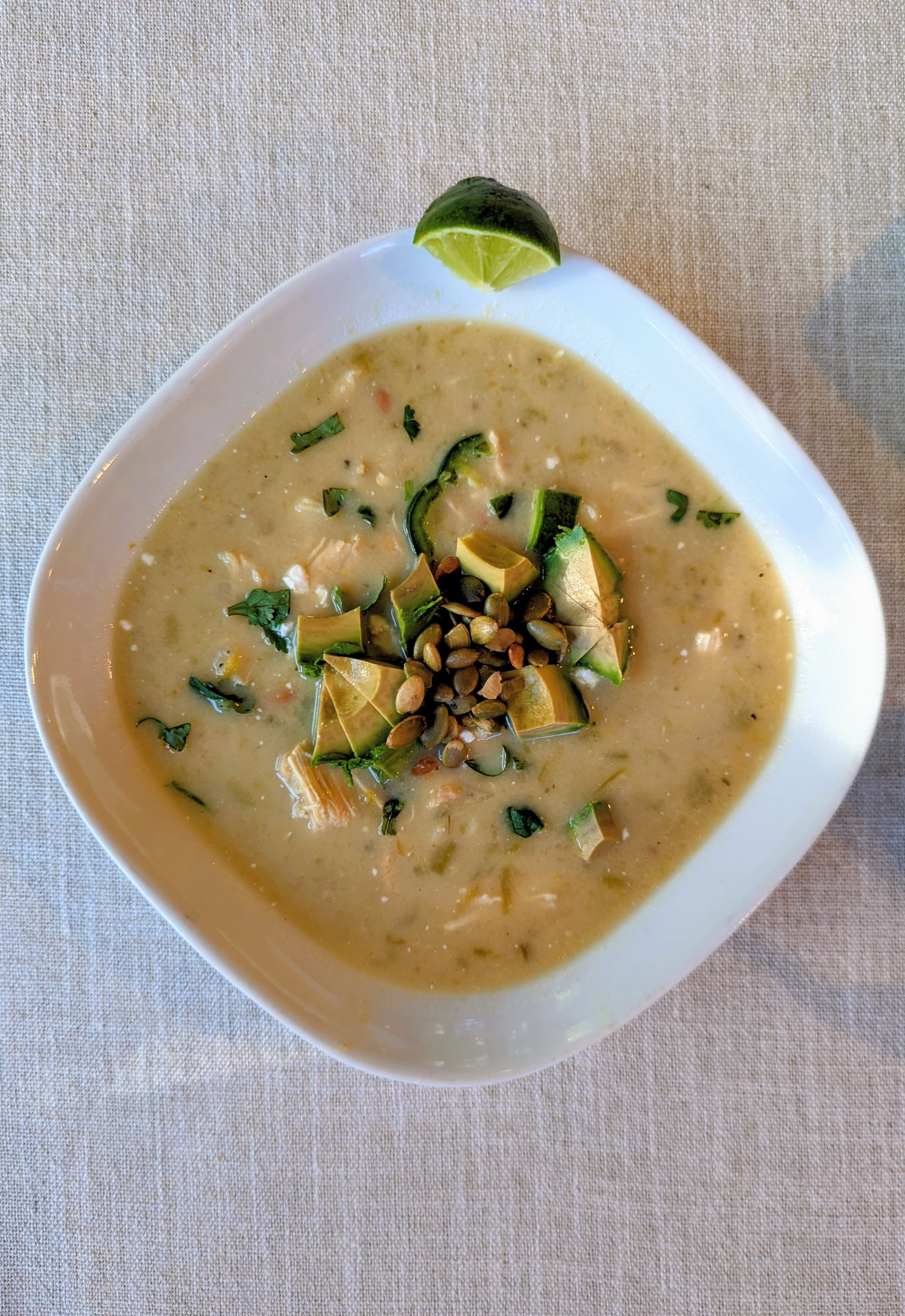 Tonight I made chicken chili Verde with two kinds of beans and garnished with avo, pepitas, jalapeño, cilantro, and lime. Mostly pantry meal.