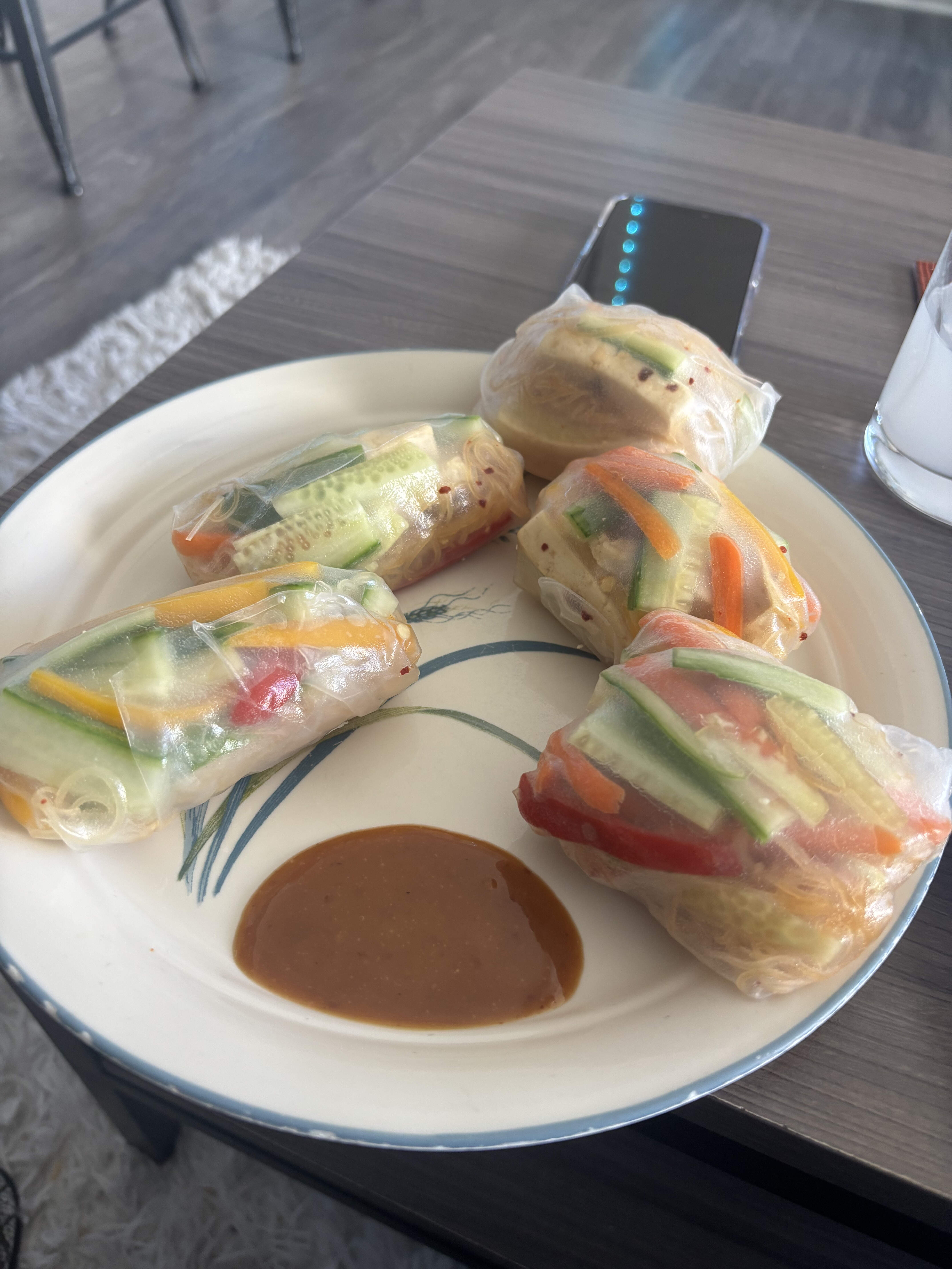 Wanted more of a fresh bite and also to get rid of some of the veg in my fridge I made these rice paper fresh spring rolls. Sliced some cucumber, peppers, and carrots and added in marinated tofu slices with some rice noodles. Wrapped it up and used the TJ’s Thai Peanut dipping sauce!