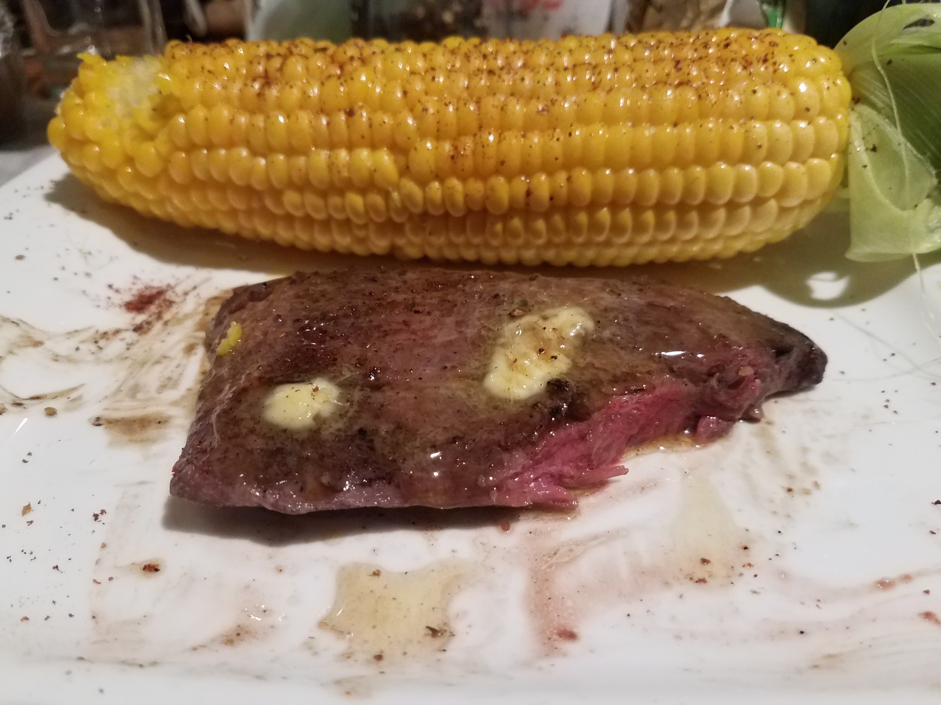Corn season doesn’t end! Good thing I had some steak to go with. After buttering and salting the corn, I sprinkled some spice blends on different parts: my sekrit rub, Mexican adobo, vadouvan. I liked my ancho-chile based rub the best, adobo next.