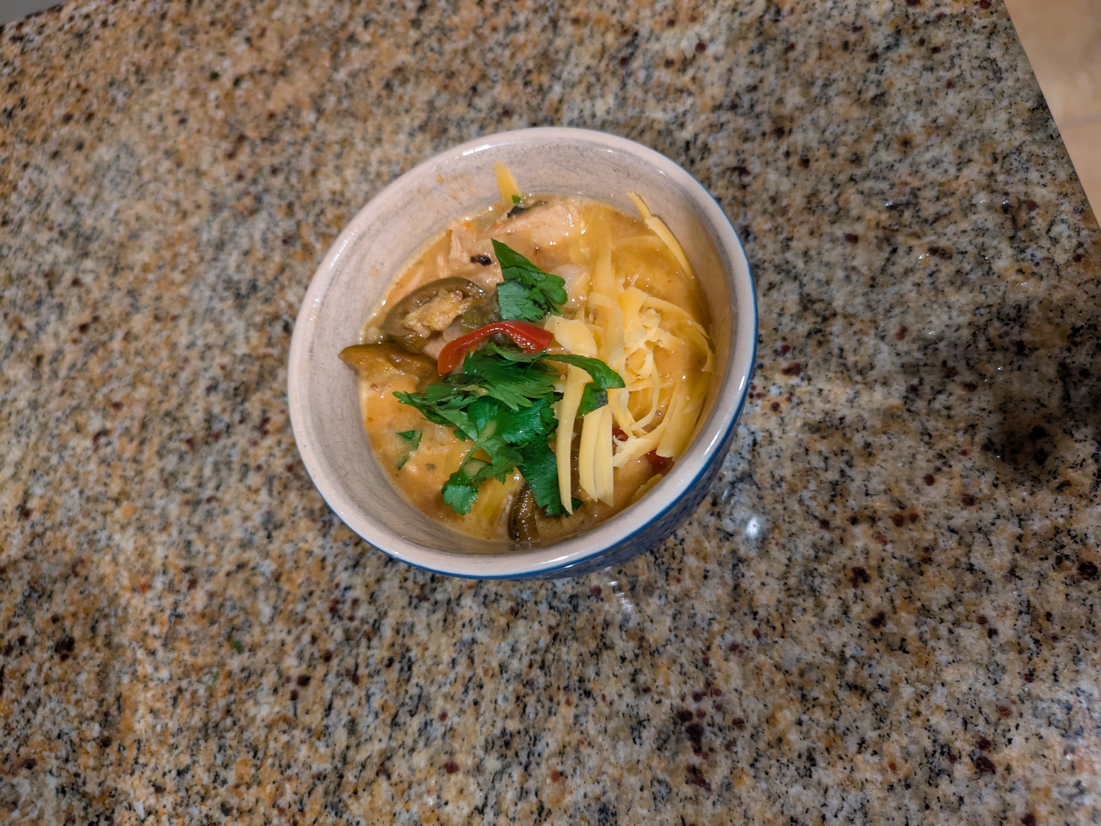 White bean and chicken chili, pickled Fresno chilis, grated sharp cheddar.