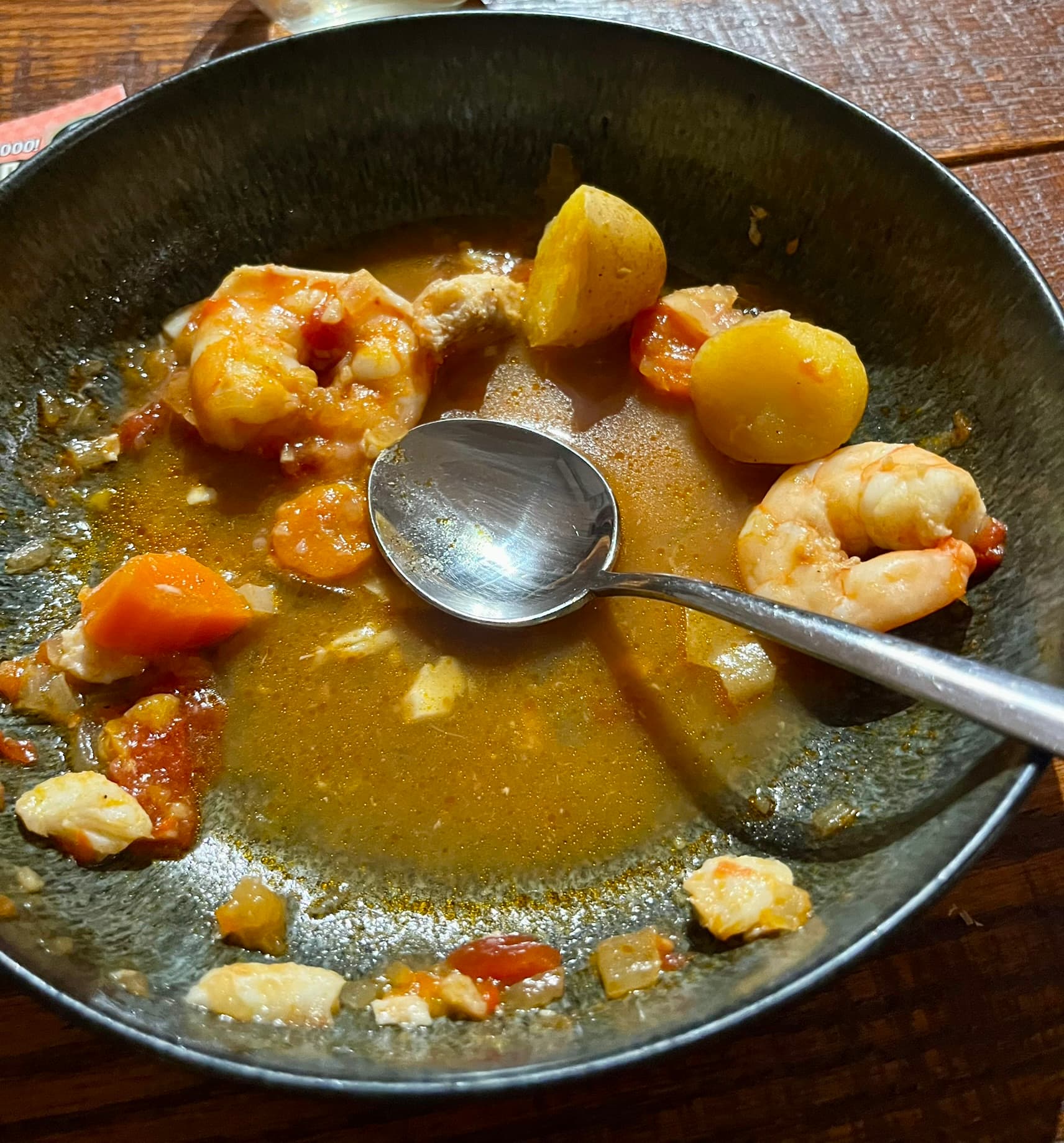 Our pesca buddy’s turn to host our weekly poker game. He made a delicious tomato-based seafood soup with cod and shrimp, and another friend brought a delectable salad.