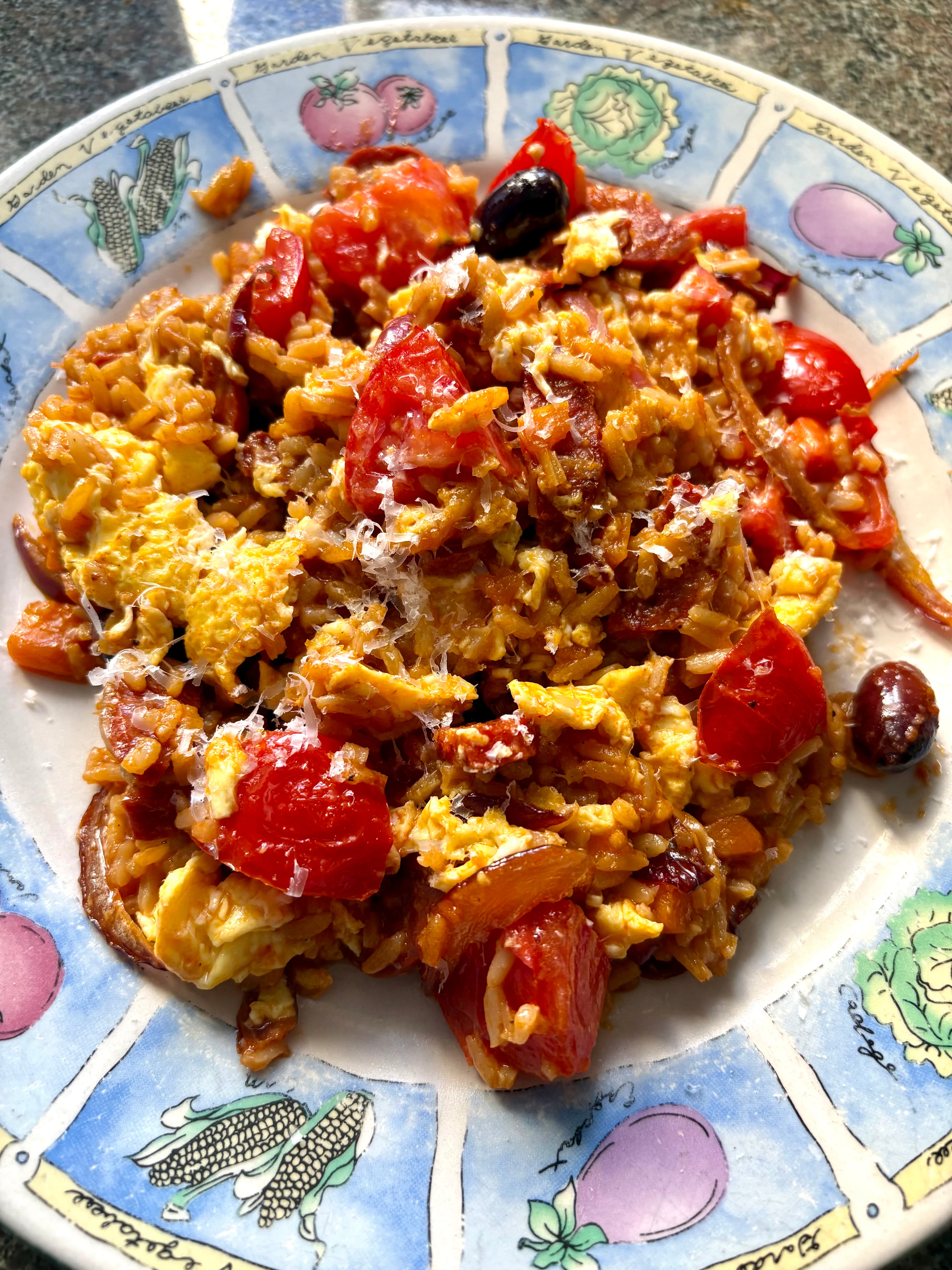 Chorizo and egg fried rice, embellished with chopped tomato, fried purple onions and kalamata olives showered with Parm/Regg.