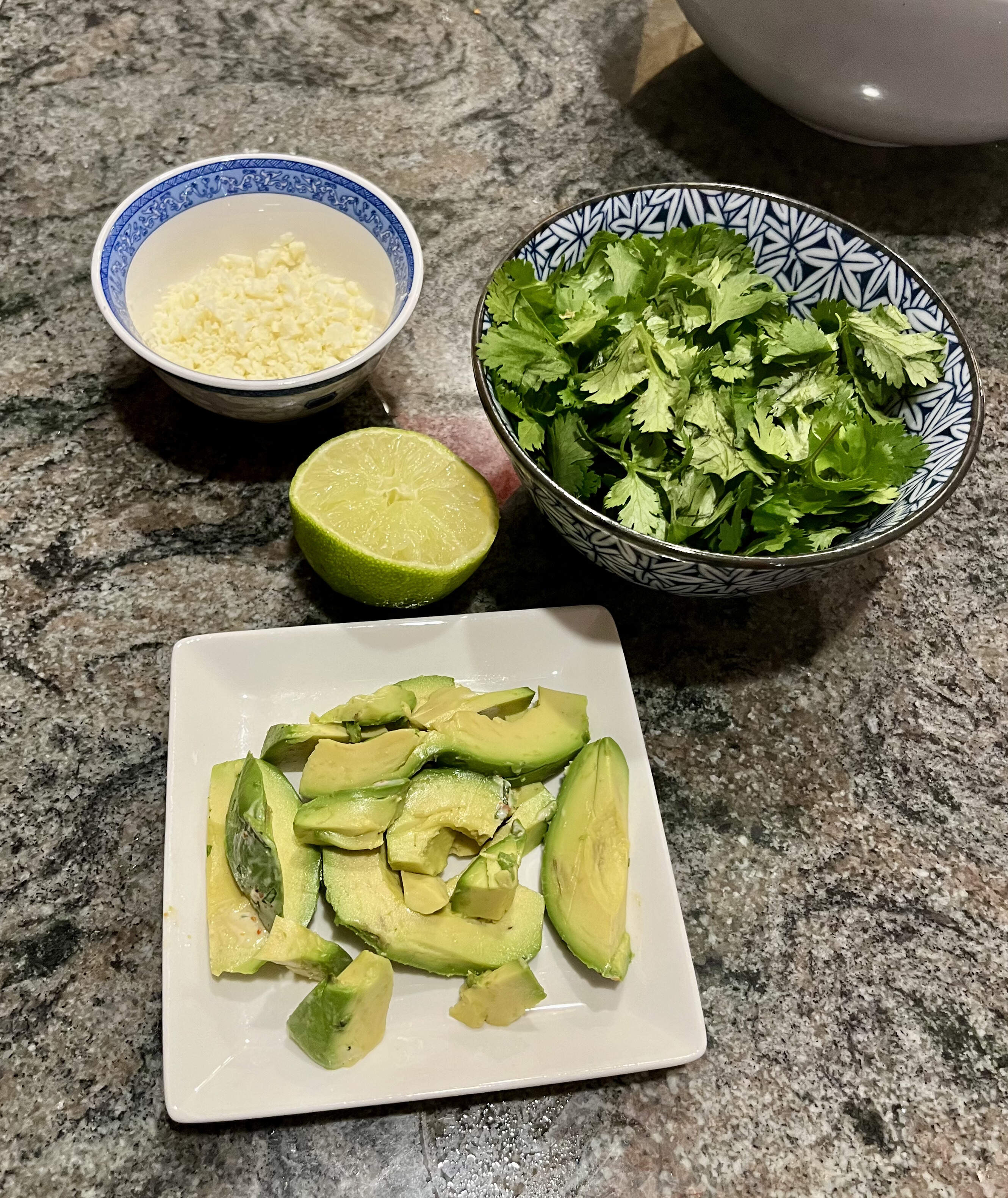 The main event was leftover pork chile verde with extra hatch chiles, which we had with pan-fried tortillas, sliced avocado, cotija, limes & cilantro,