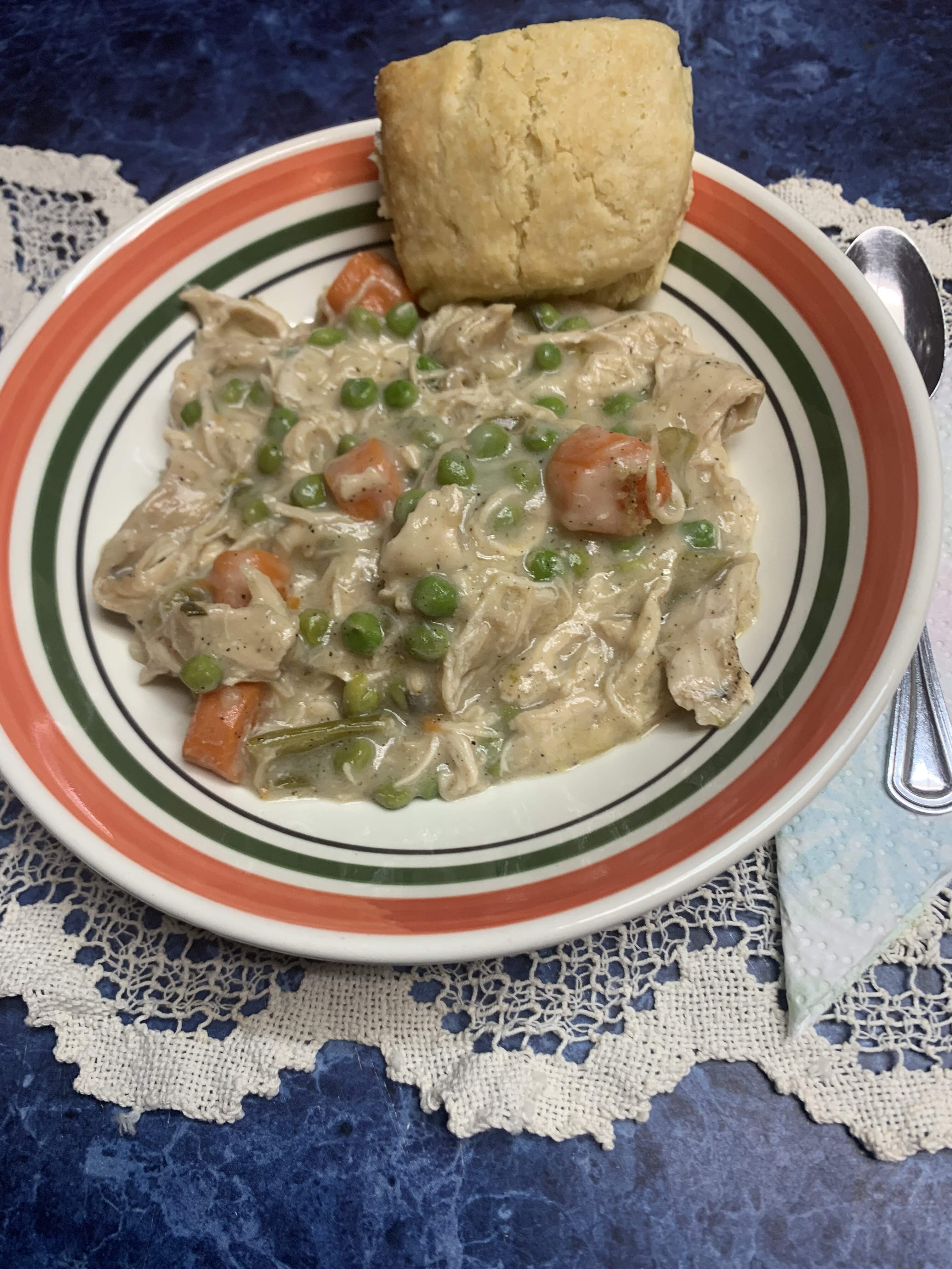 Dinner tonight. Halved a 4 c. flour buttermilk biscuit recipe. Should’ve rolled out thicker and cut 6 instead of 9.  Next up was my first time Chicken Pot Pie Soup. Too much roux, not enough chicken stock from cooking the chicken to go around. A little extra white wine and half & half did the the trick. Sort of. I pretty much wound up with a stewp. Not exactly memorable but still pretty good.