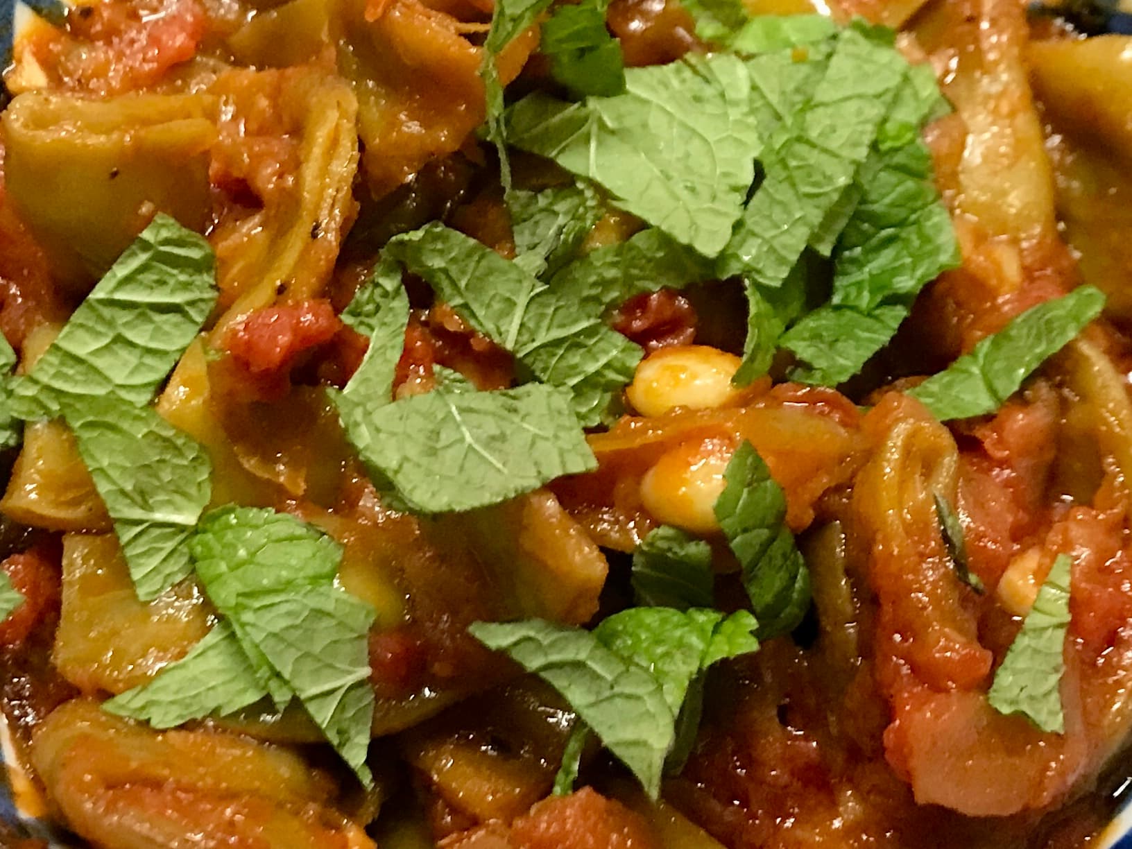 And drug these Turkish-style braised green beans outta the freezer and threw some mint on them.