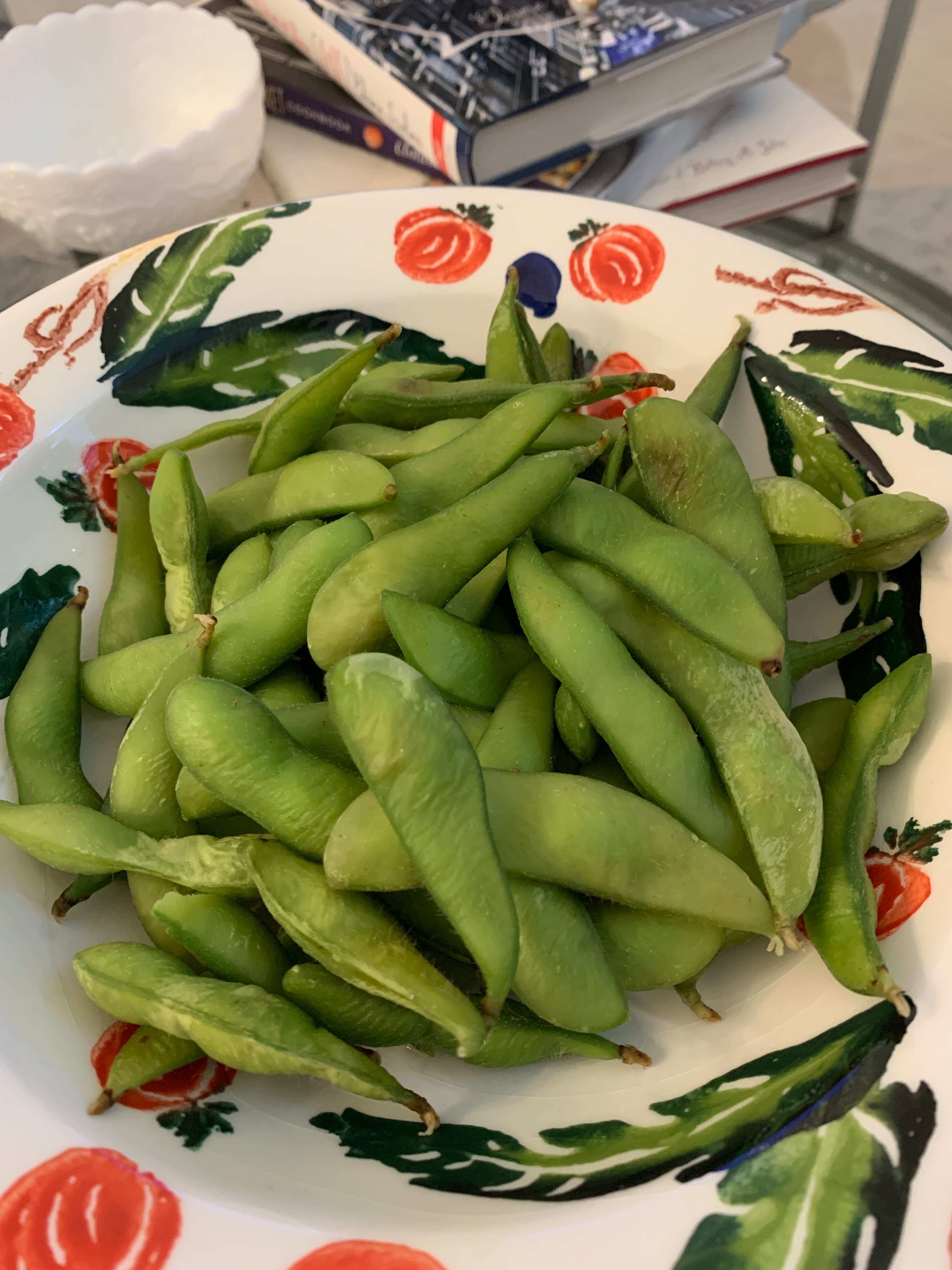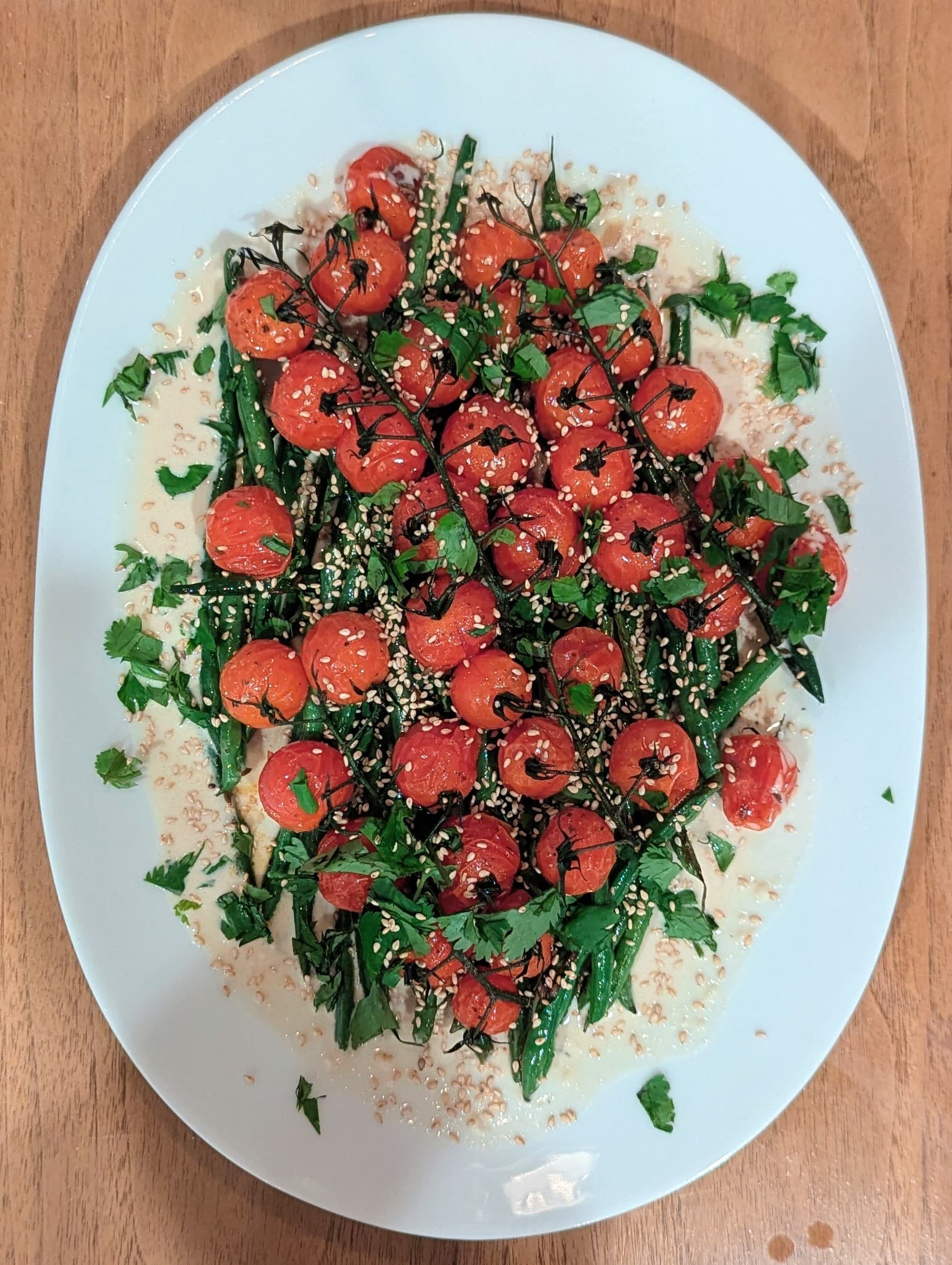 I made “cheater’s Hawawshi pitas” [with ground chicken and adding harissa] from the Mediterranean Dish Cookbook and Diana Henry’s roasted green beans and vine tomatoes with cumin seed and tahini yogurt. Also a kale Caesar with tomatoes and cucumbers since we’re breaking rules anyway.