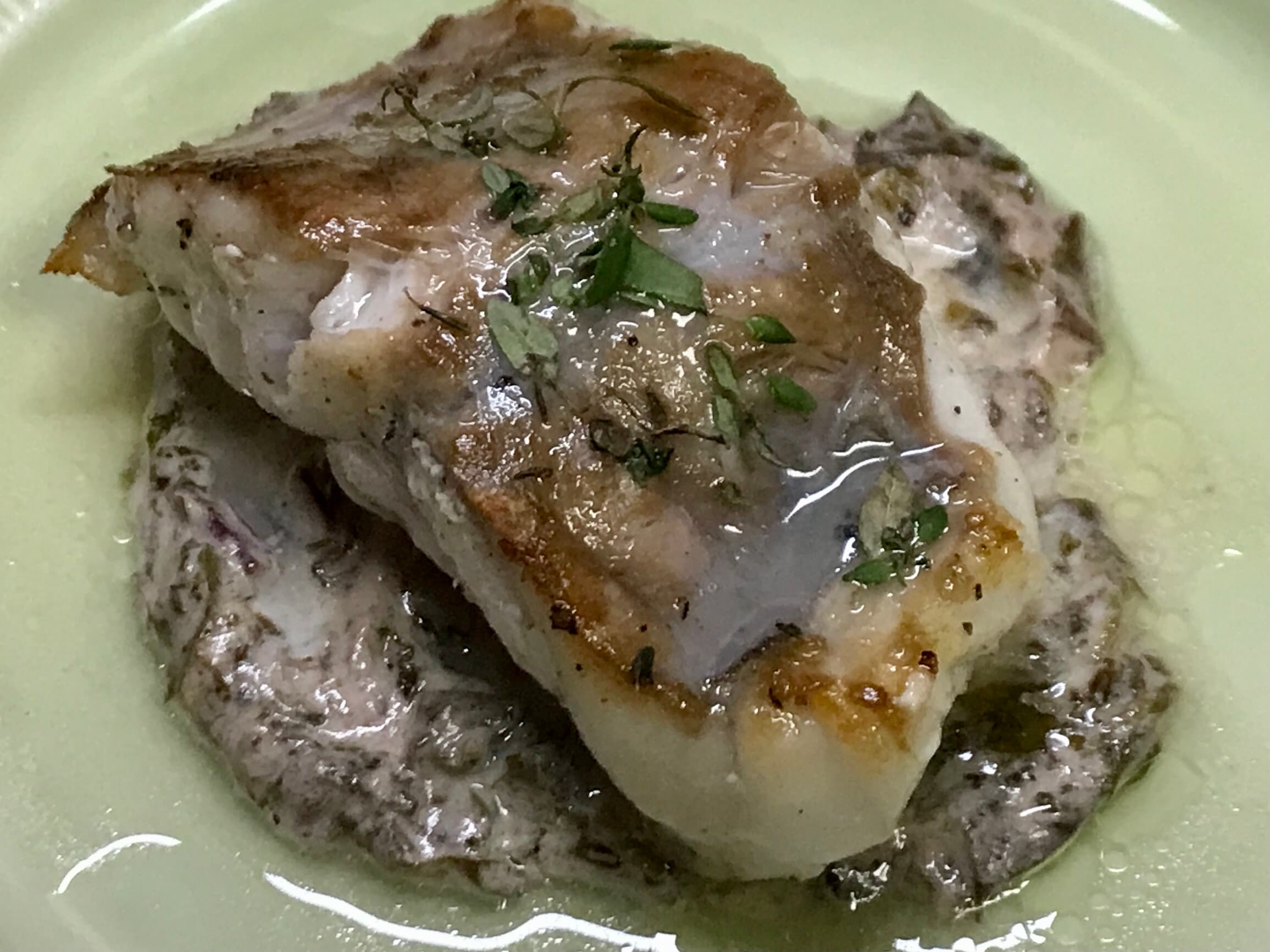 The balcony garden is winding down, so I took in all the viable sorrel and chard (of which there was not a whole helluva lot) and made it into a sauce for this nice piece of monkfish.