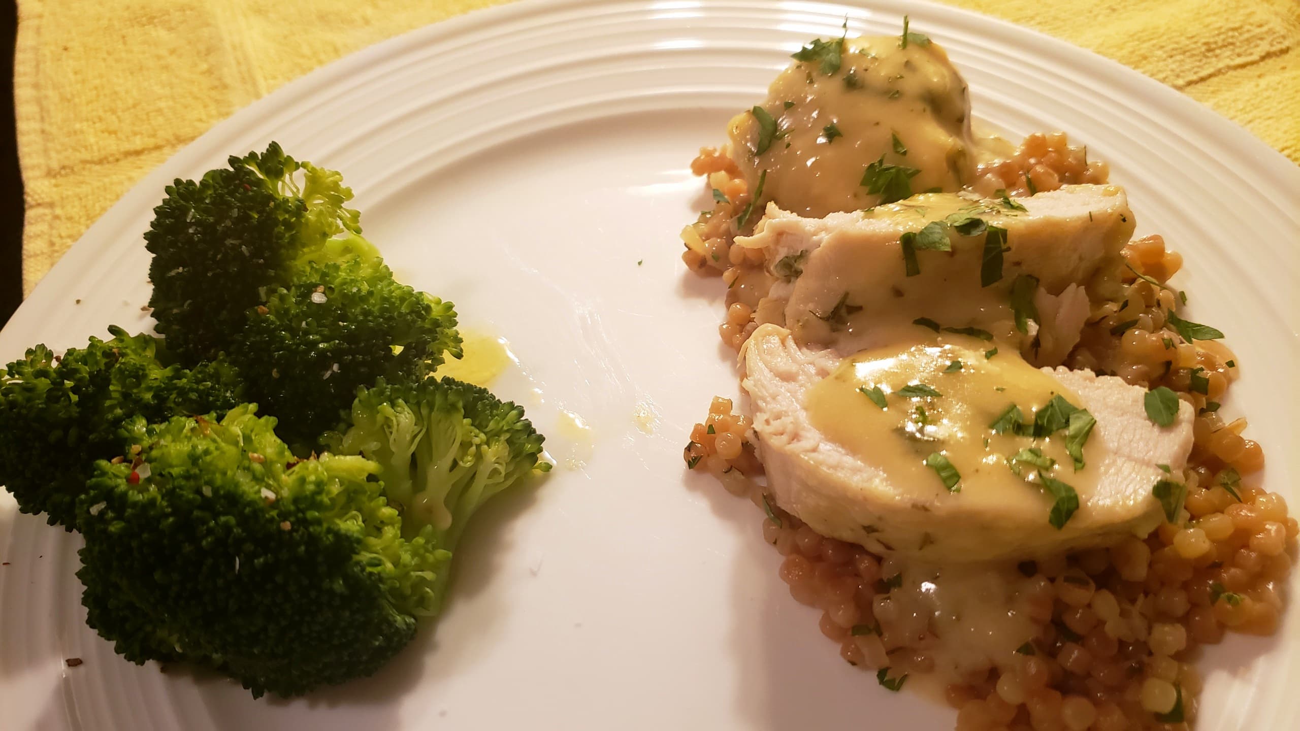 Sides were toasted Israeli couscous cooked in BTB chicken stock and lemon juice with some Penzeys dried shallots and ground pepper, and steamed broccoli.