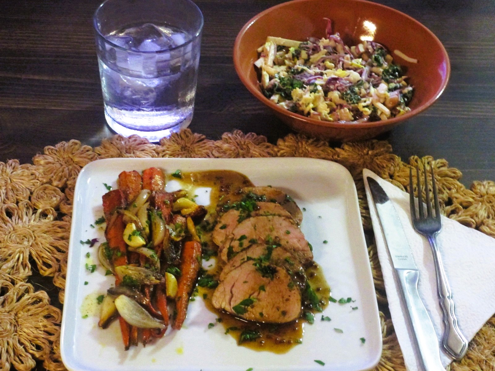 Dinner was seared and roasted pork tenderloin with a maple syrup, brown sugar, mustard, bourbon sauce. Roasted carrots, shallots, garlic and butter. Savoy & red cabbage, kale, celery, apple slaw, Oregon hazelnuts, creamy curry dressing. There was a Manhattan.