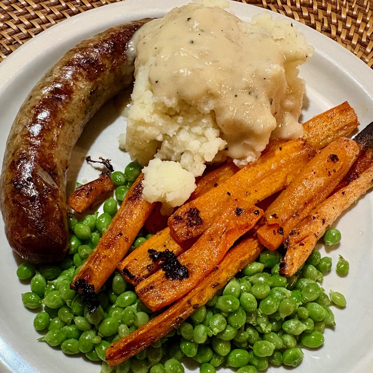 Fall is here and Happy Halloween! An easy cook tonight while we await the horde of no-shows. I think we’ve had a total of 3 trick-or-treaters since we moved here 8 years ago. No worries – more (real) chocolate for us! WFD was all from the fridge and freezer: bangers and mash, pork-and-onion gravy, carrots and baby peas from the garden.