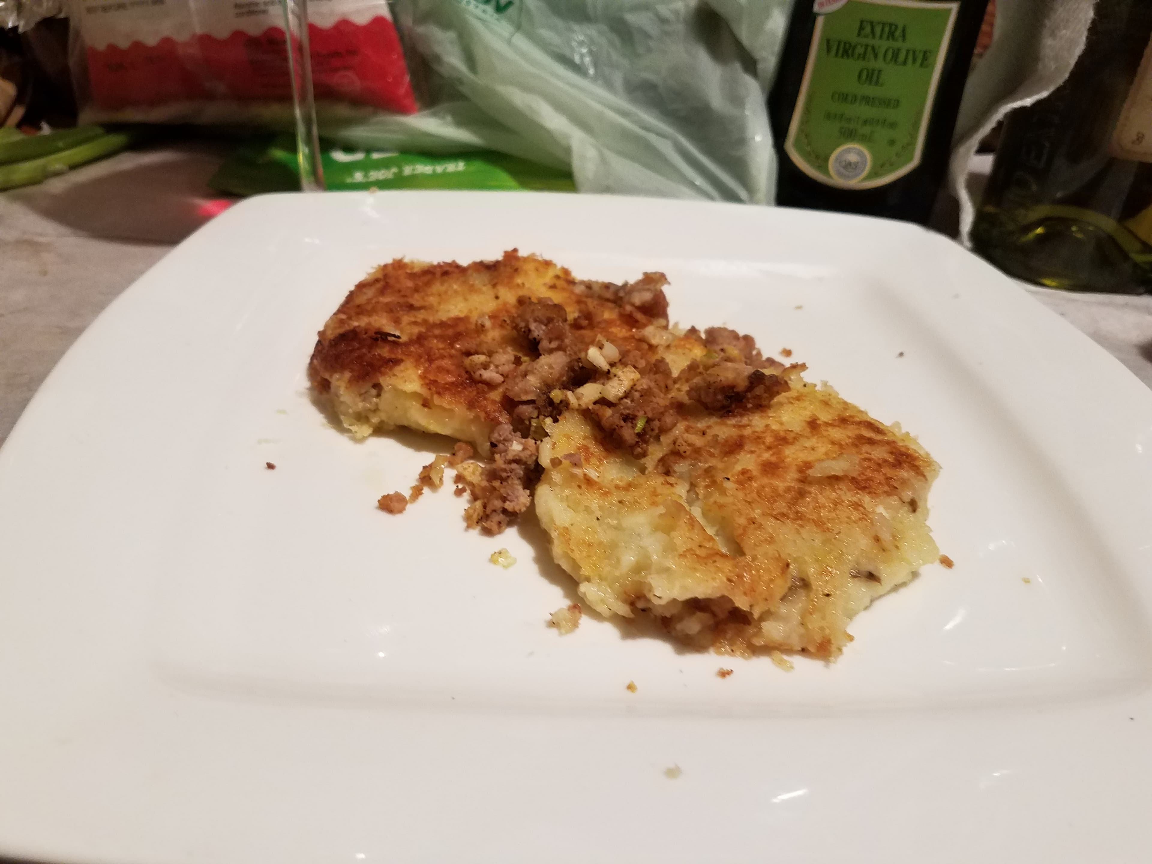 I saw the article about Beef Chops (Meat-Stuffed Potato Cutlets) in the NY Times. Simple enough–I had leftover mashed potatoes and meatballs. Simple enough, form the mashed potato into patties, add the chopped meatballs (with garlic and scallion) on top, cover with more potato, egg and panko dredge, shallow fry. I used duck fat. The meat kind of dissolved into the potato, so I scattered some leftover meat over them.