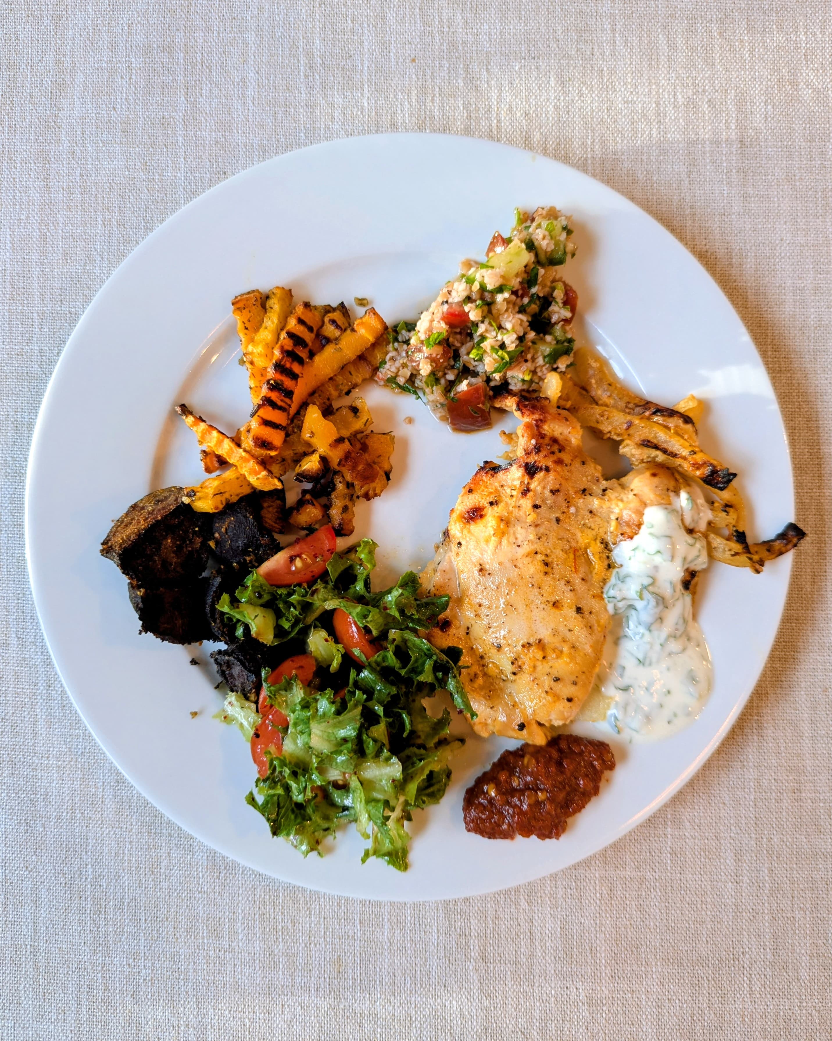Last night I made Samin Nosrat’s chicken thigh joojeh kebabs marinated in saffron-garlic yogurt with herbed yogurt sauce, tabouleh, roasted butternut squash and beets, green salad with sumac-pom molasses vinaigrette, and a few tater tots. Concluded I just don’t care much for what even a few hours in yogurt marinade does to protein texture. Oh well.