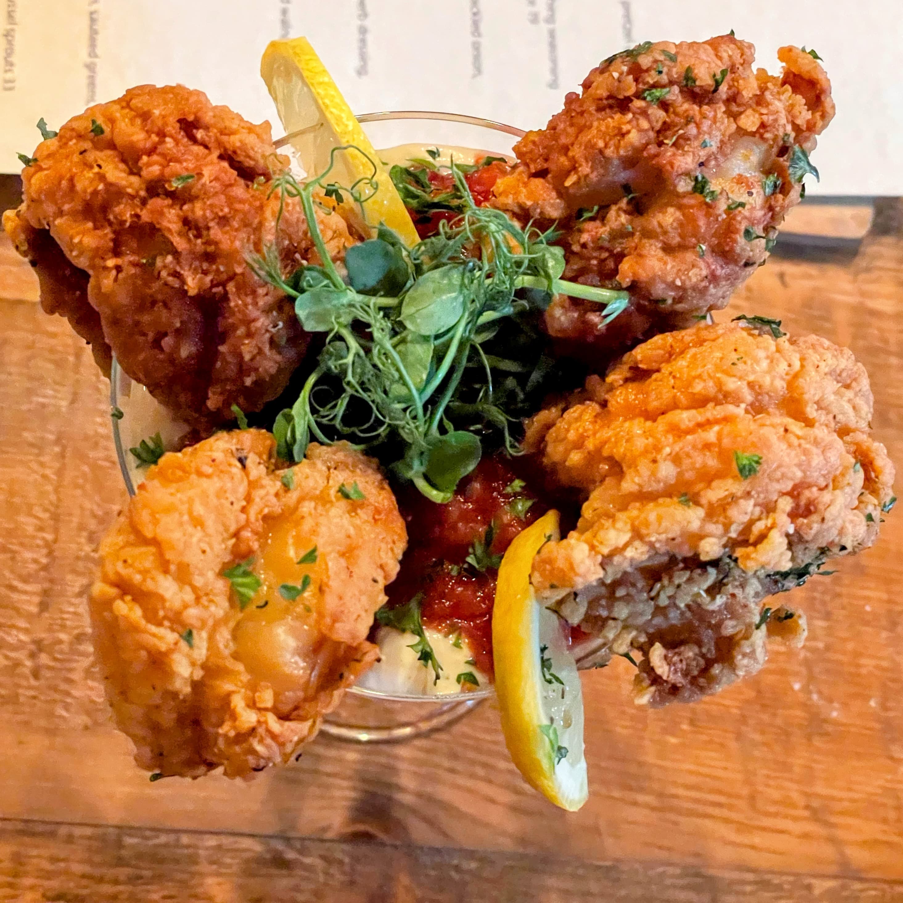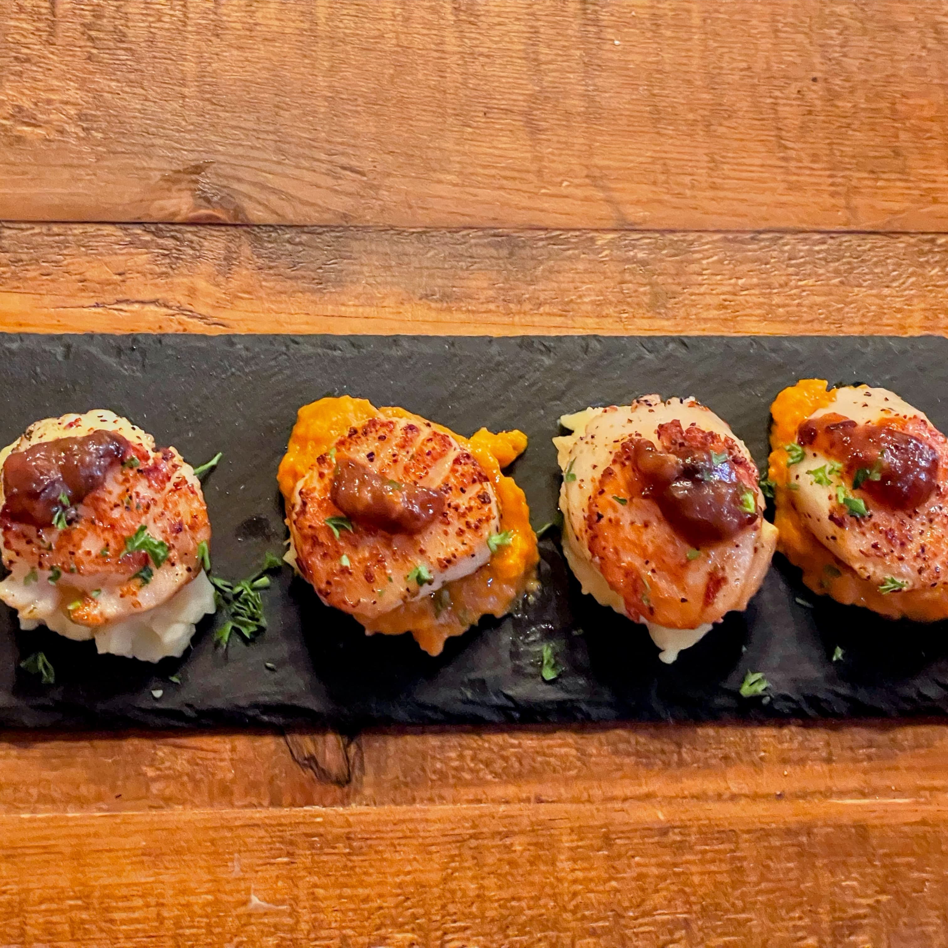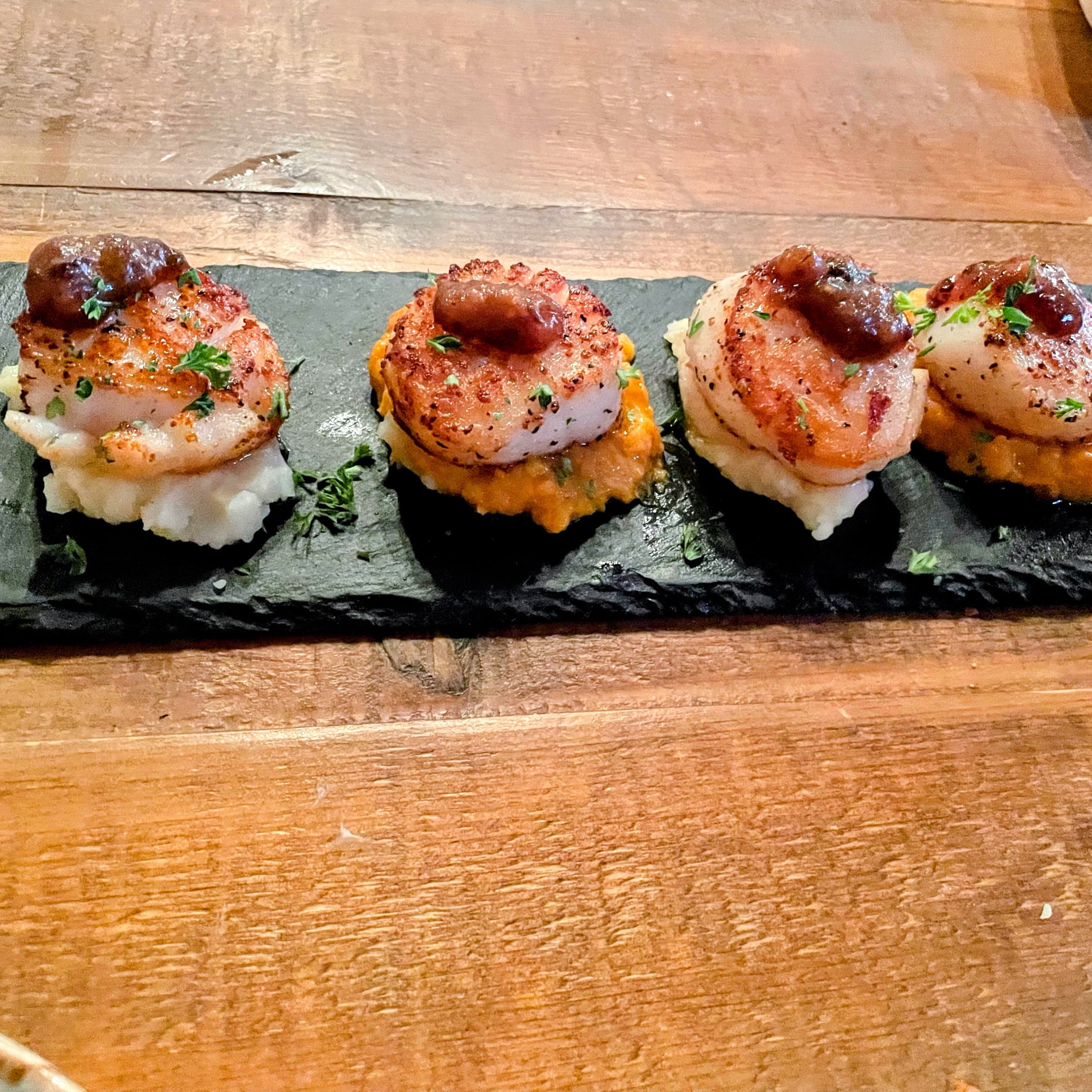We started off Mrs. P’s birthday weekend with an excellent dinner at The Farmer’s Daughter in Newton, NJ, including an awesome crispy shrimp cocktail with everything seasoning crema and homemade cocktail sauce; grass fed meatballs with sweet potato chipotle sauce; buttery scallops topped with bacon jam over sweet potato and regular mashed potatoes; veal porterhouse topped with fried arugula. It all went great with a couple of excellent red blends.