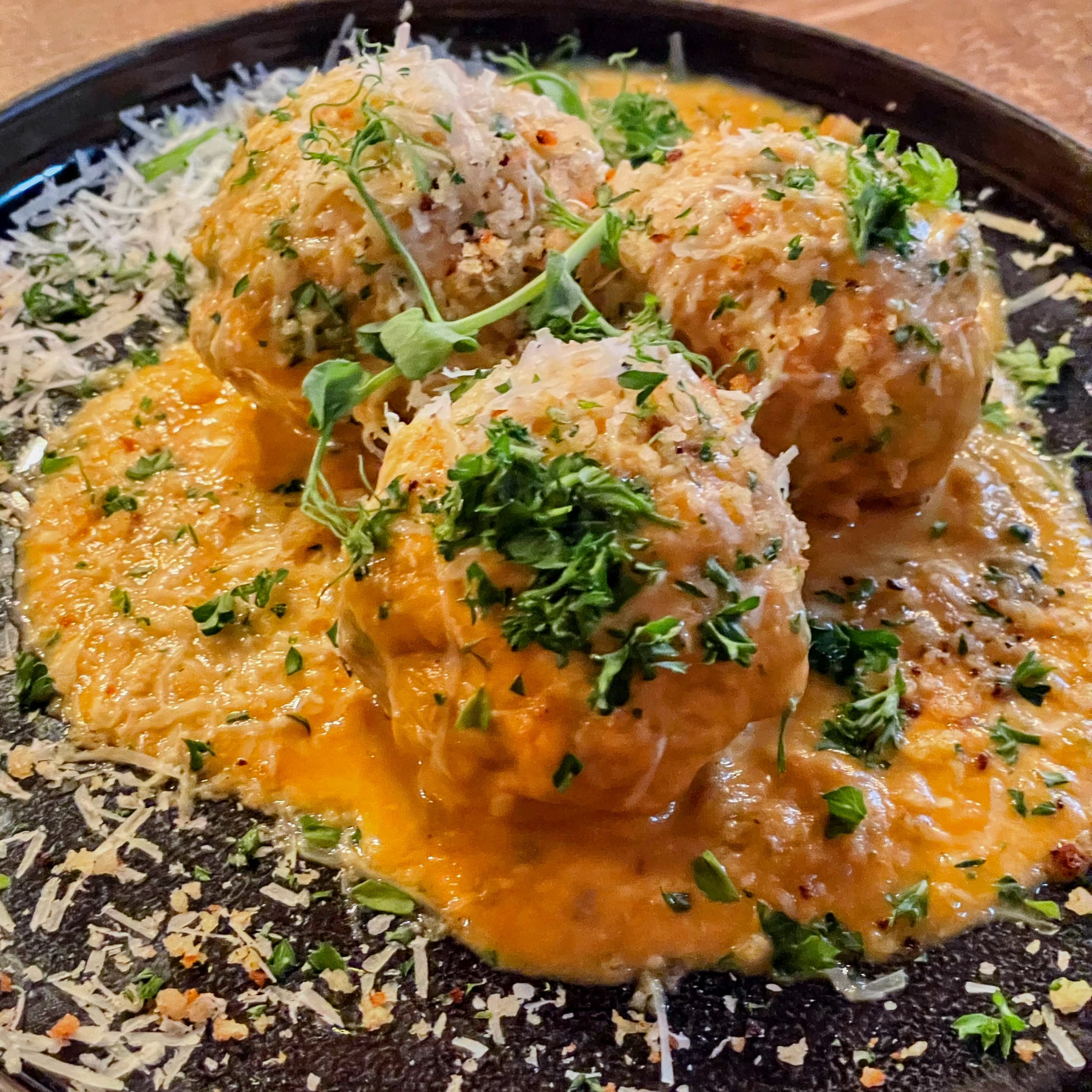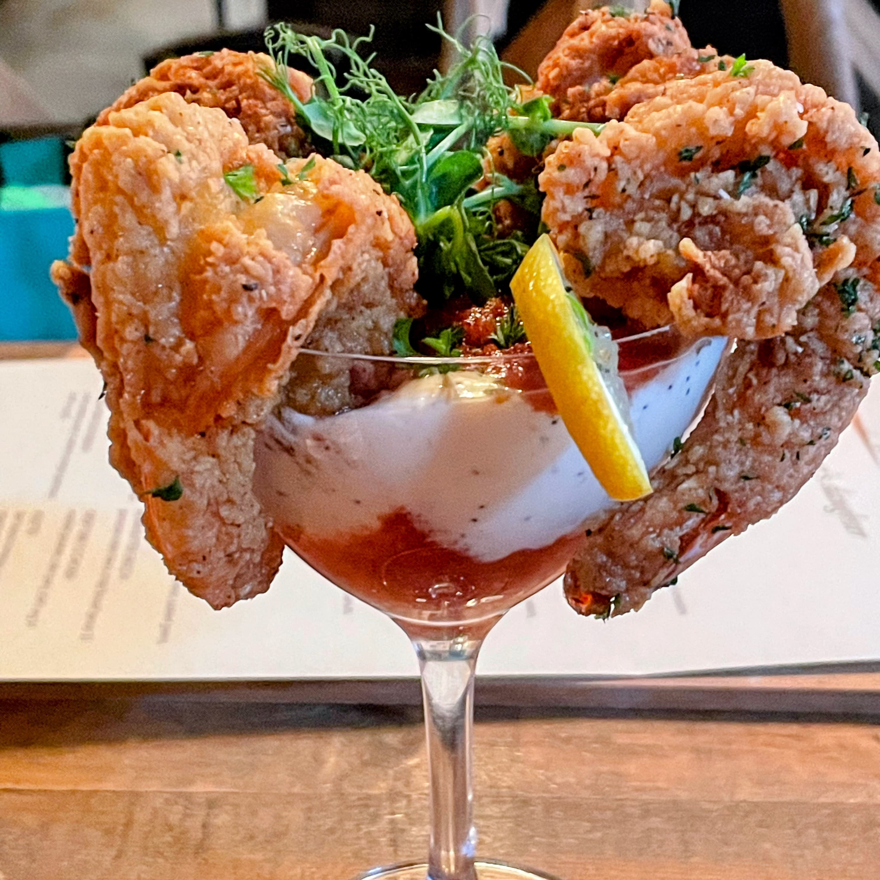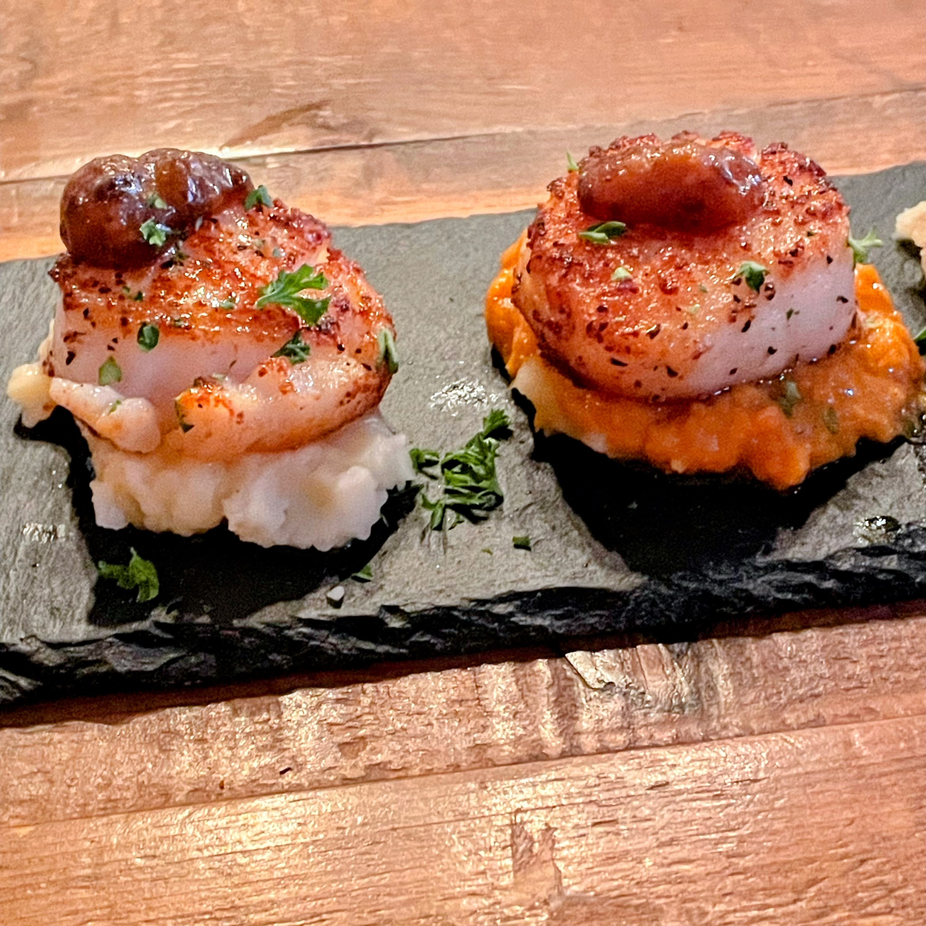 We started off Mrs. P’s birthday weekend with an excellent dinner at The Farmer’s Daughter in Newton, NJ, including an awesome crispy shrimp cocktail with everything seasoning crema and homemade cocktail sauce; grass fed meatballs with sweet potato chipotle sauce; buttery scallops topped with bacon jam over sweet potato and regular mashed potatoes; veal porterhouse topped with fried arugula. It all went great with a couple of excellent red blends.