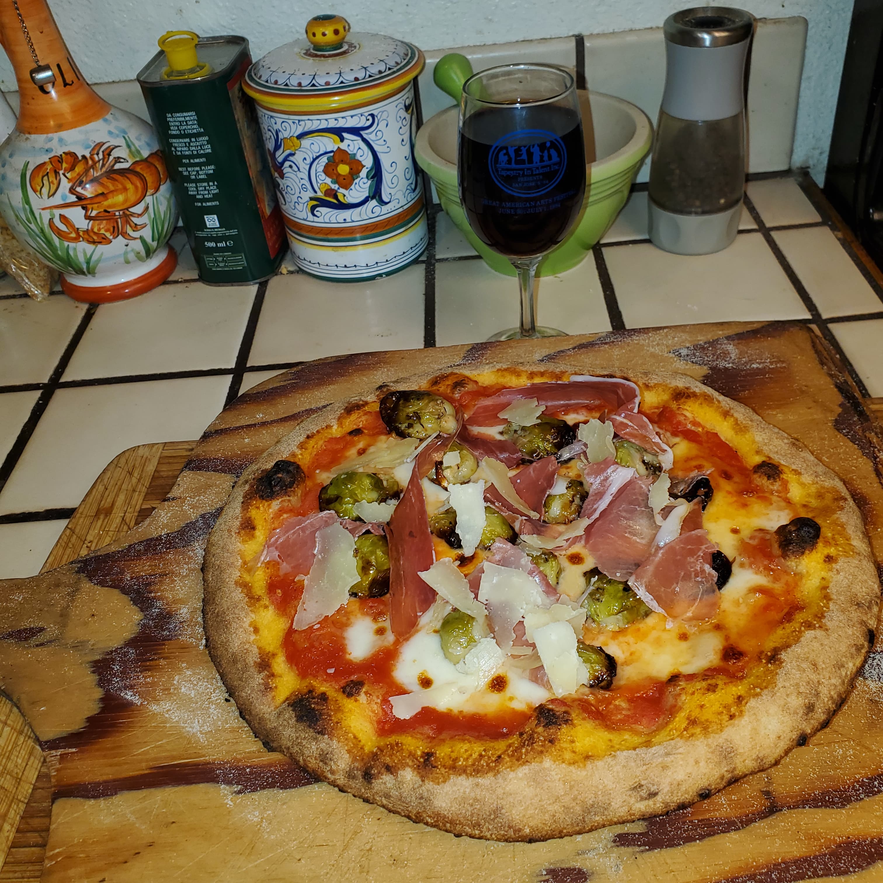 Pizza Saturday. Base of tomatoes run through a food mill. Topped with fresh mozzarella. Roasted Brussels sprouts , shredded speck , and shaved pecorino . Cheers.