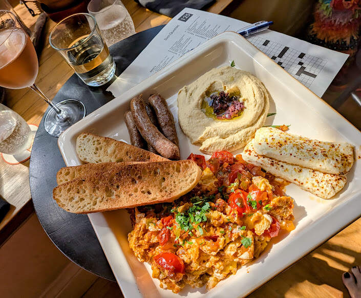 BF’s brunch today was Menemen, a Turkish dish of scrambled eggs, tomatoes, and peppers, flavored with Aleppo pepper, among other things. He made hummus too, and served it alongside merguez and fried cheese. Delicious, all of it.