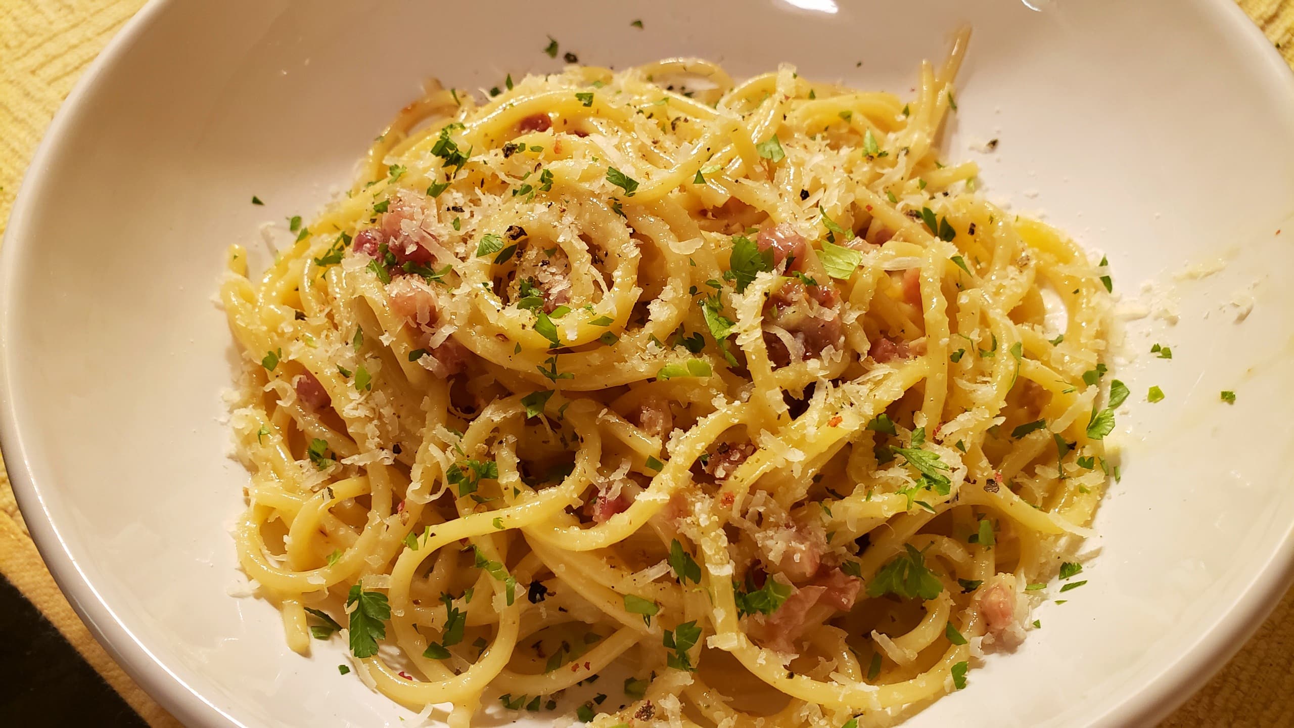 Using the NYT’s recipe, dinner was Spaghetti Carbonara, using pancetta and grated Parm-Reg. A schprinkle of minced fresh parsley for color.