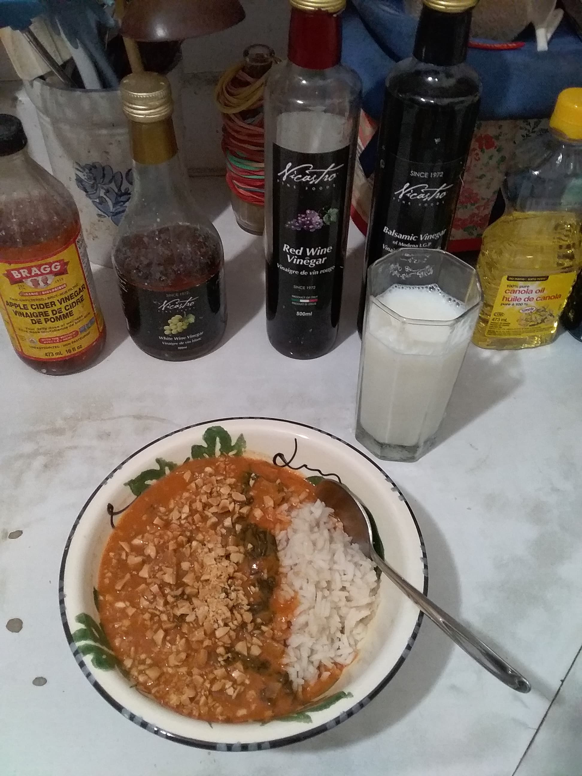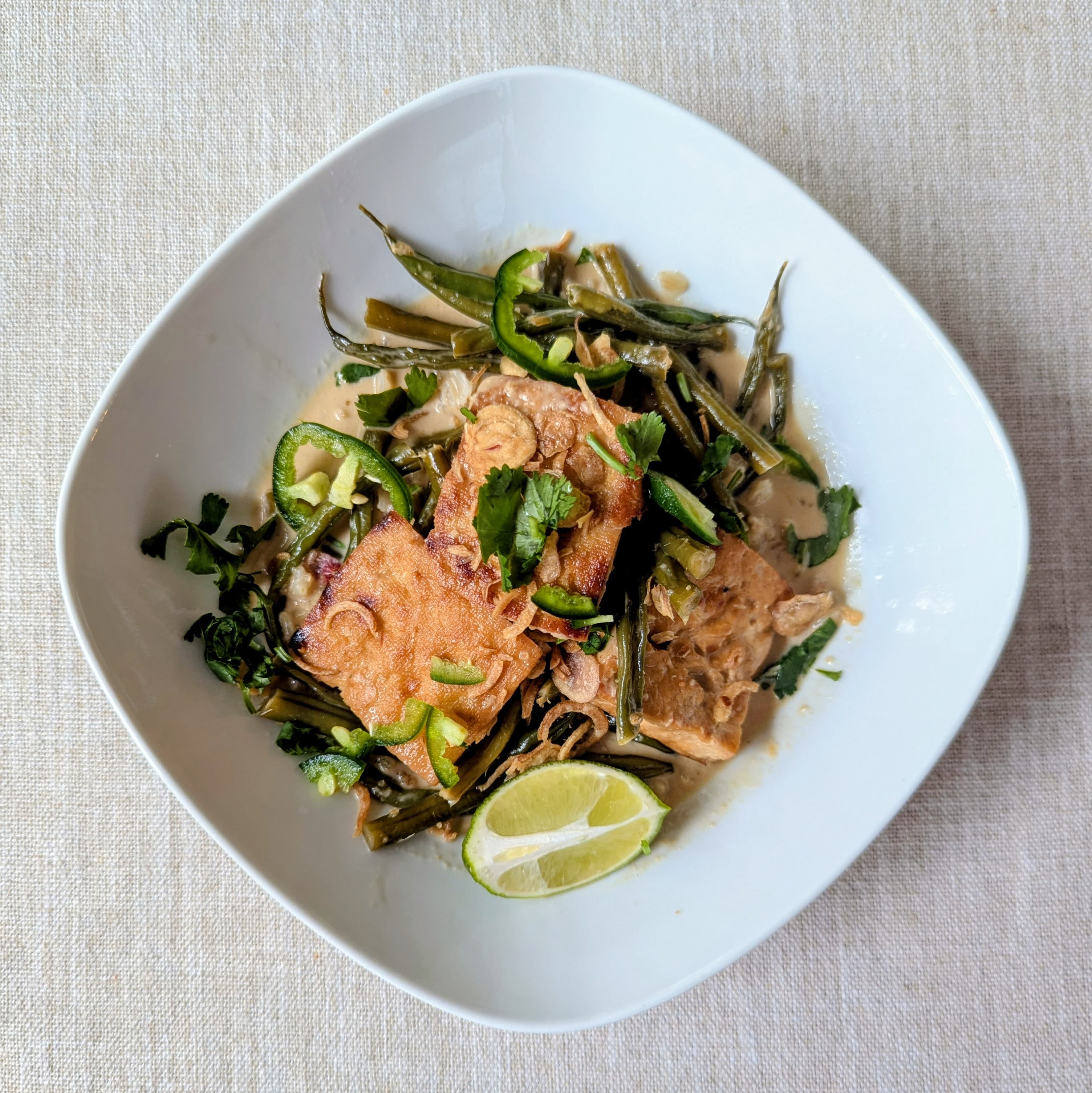 Tonight I made sticky coconut milk-braised tofu from Big Vegan Flavor with haricots over brown rice. I reduced the soy sauce and agave syrup a bit and added some ground galangal and black pepper. Garnished with crispy shallots, cilantro, jalapeño, and a lime wedge.