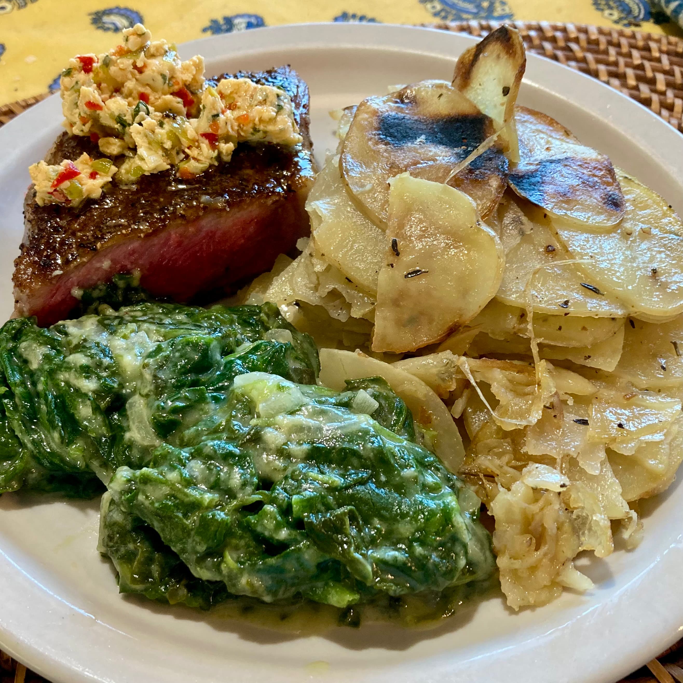 A pan-roasted NY strip steak for two. Creamed spinach and shallots. Leftover potato gratin . Casino butter on everything.