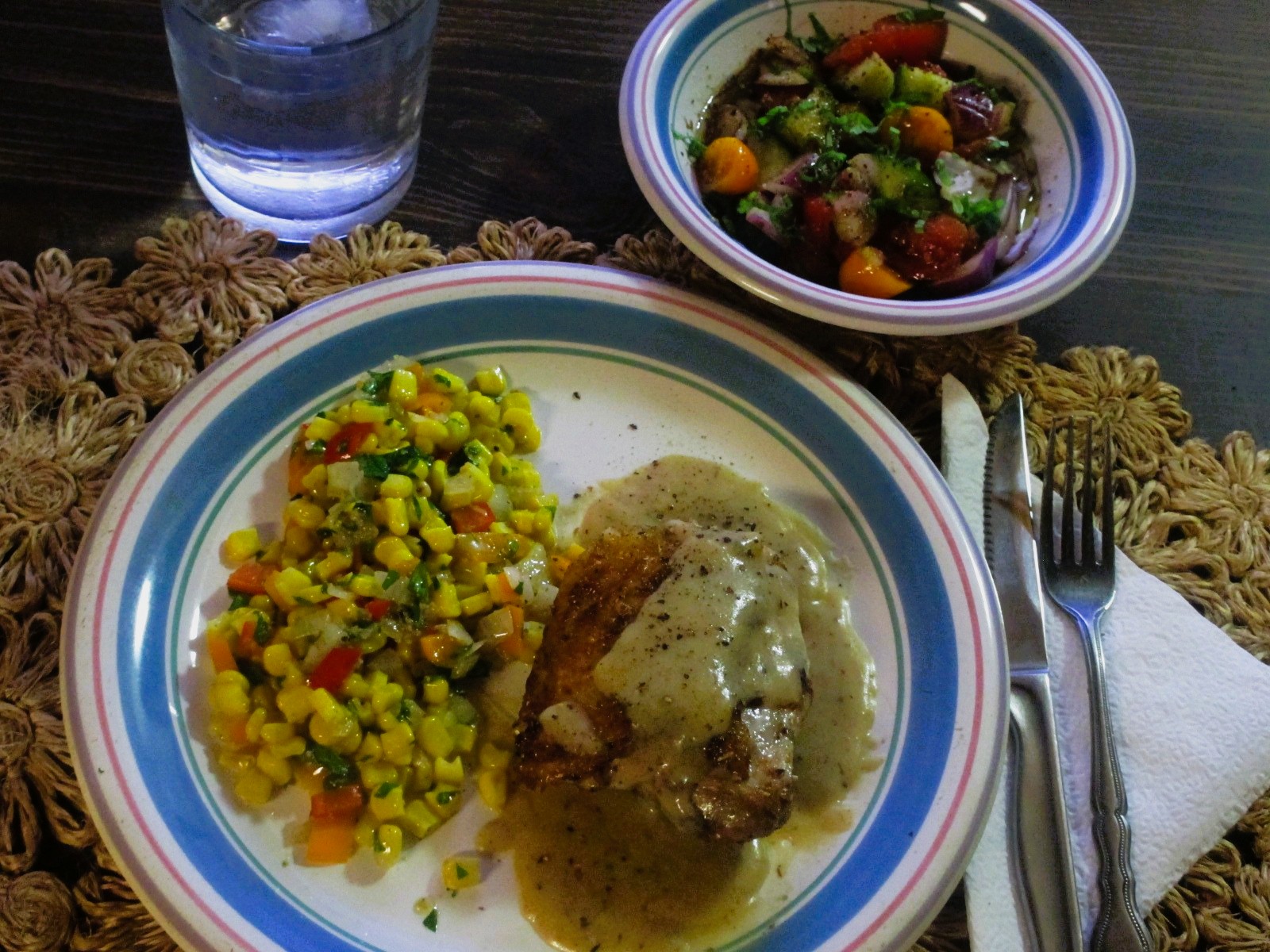 Seared and roasted biso chicken thigh, cream gravy. Corn, onion, baby bells, butter, parsley. Tomato, cucumber, red onion salad, oo & balsamic dressing, basil.