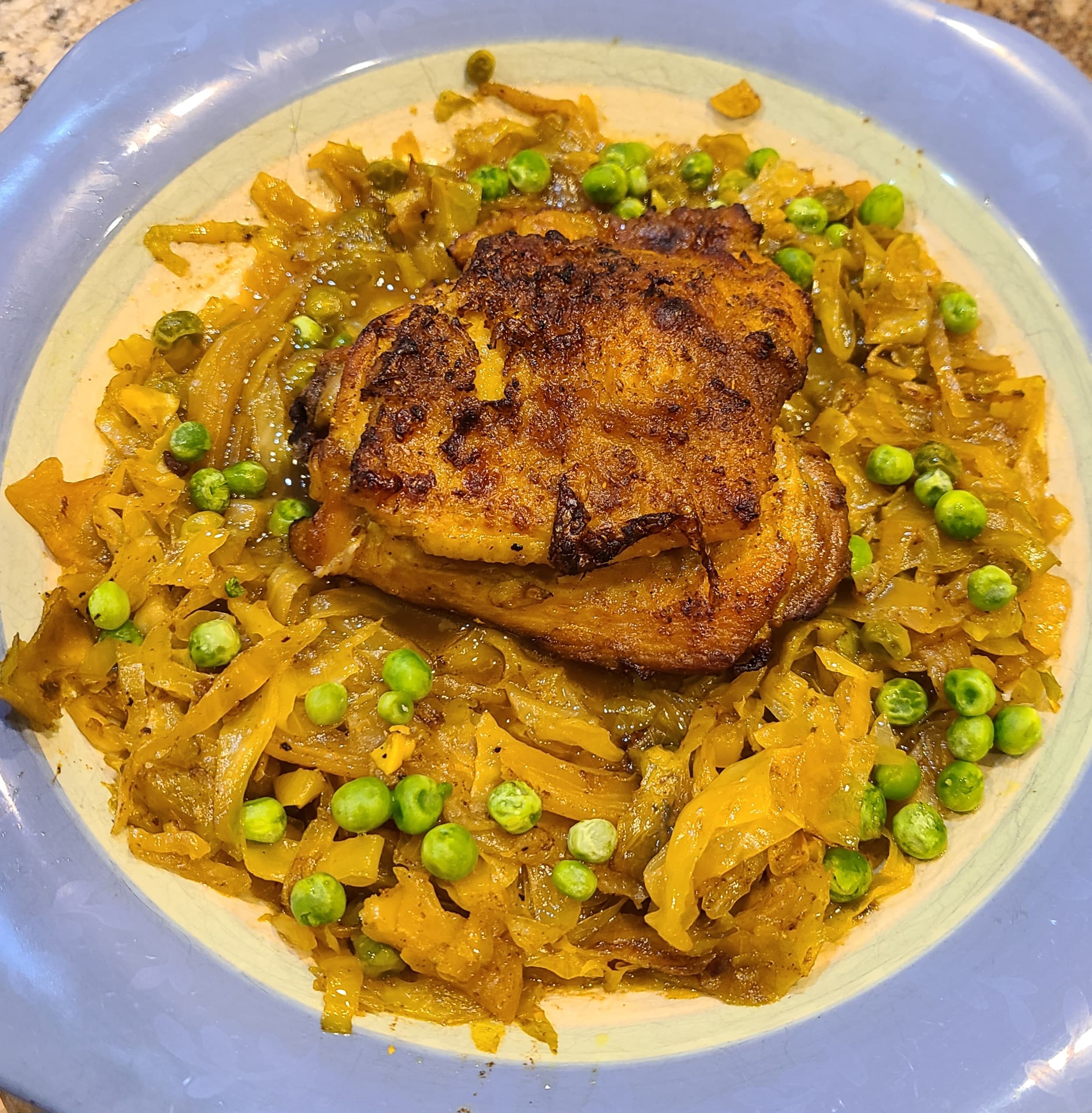 Made these chicken thighs using an Epicurious recipe for thighs with lemon, quasi-curry, cabbage and peas (someone had linked their “47 chicken thigh recipes” on a chicken-thigh specific thread).