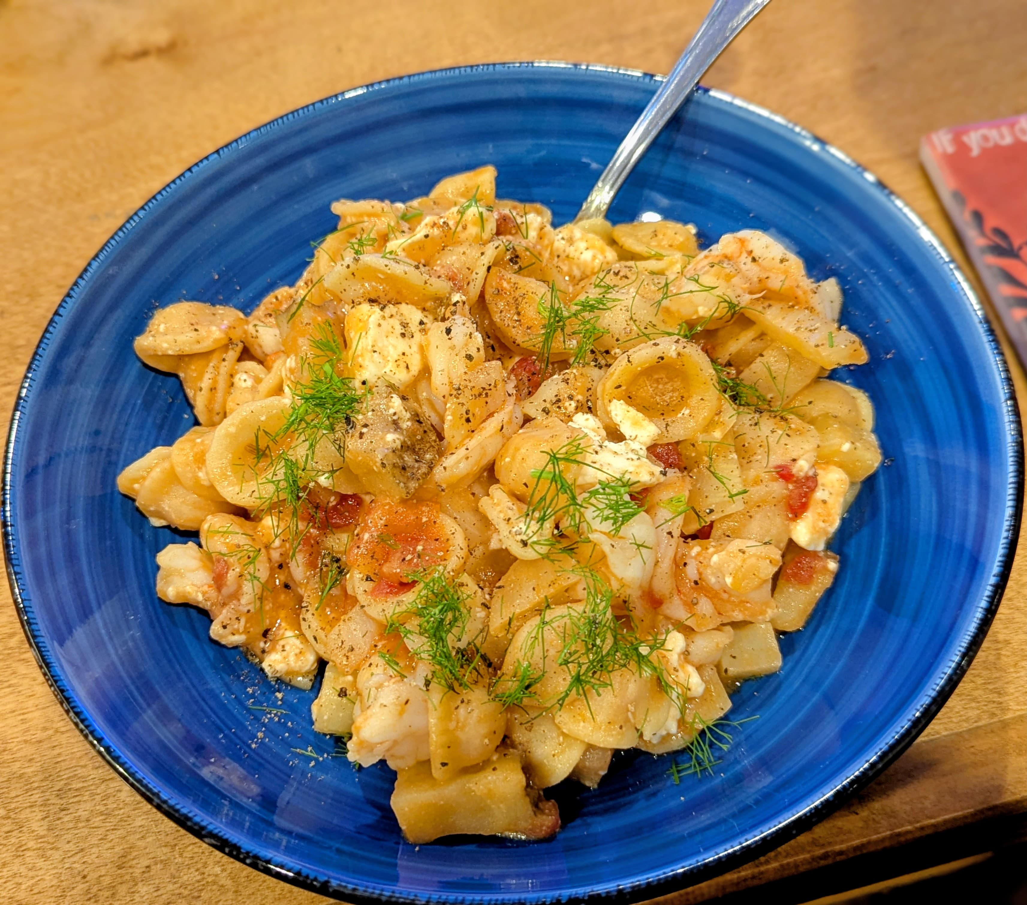 Shrimp and orecchiette with feta, tomato, and fennel, adapted from Ottolenghi:
