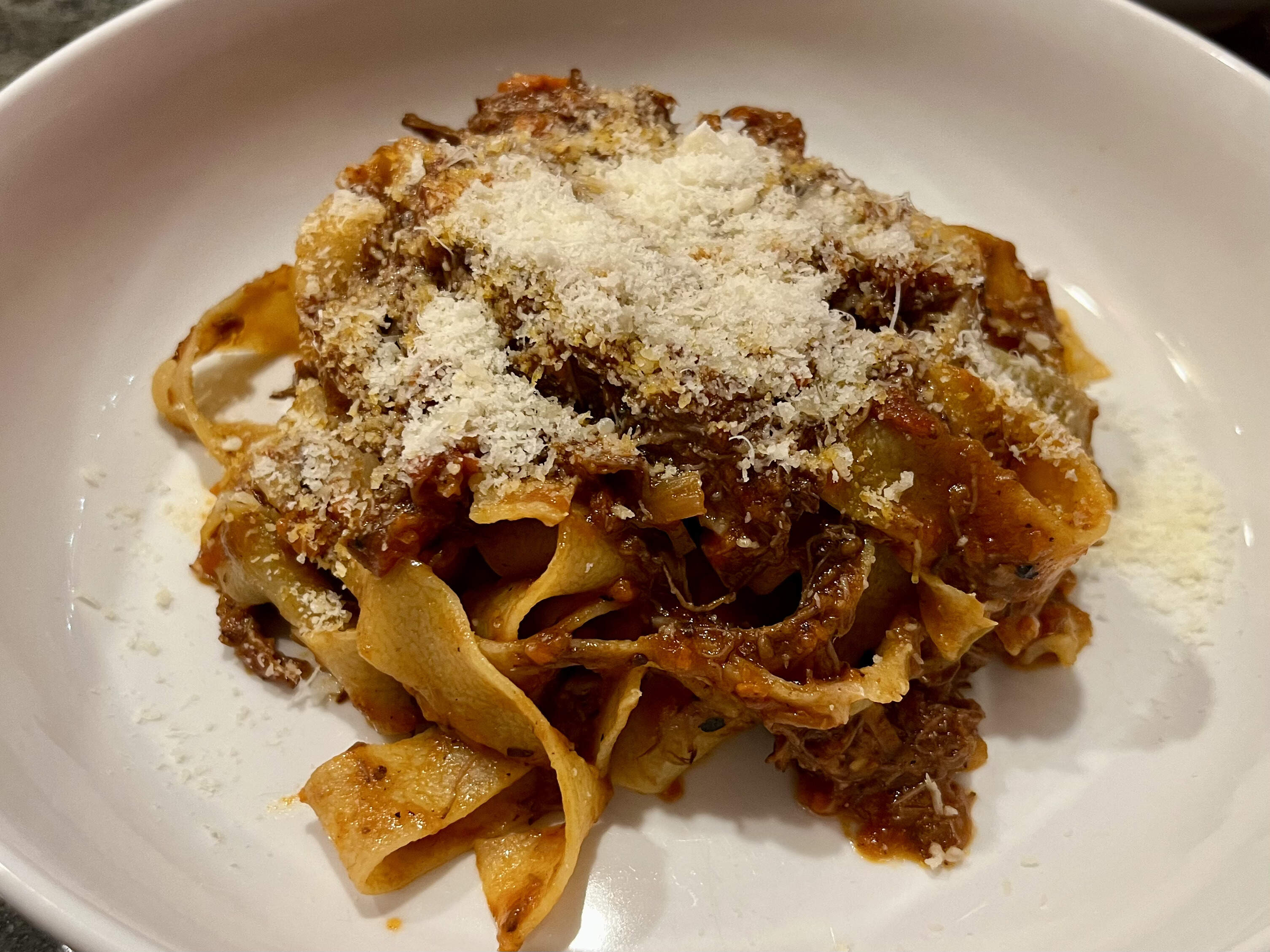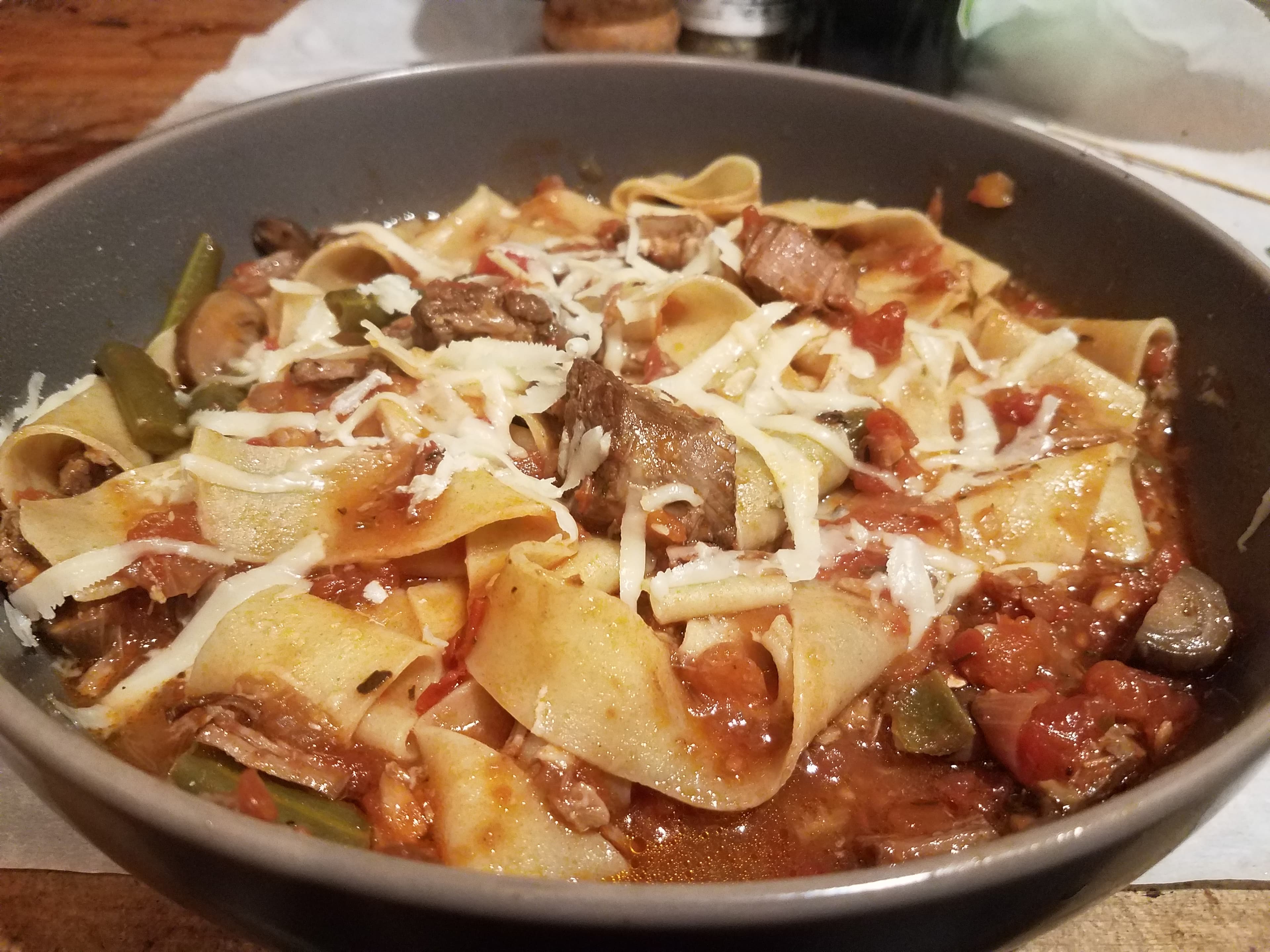 As mentioned in the NYT recipe thread, I pimped The Jamie Oliver Disaster yesterday (melted anchovies, toasted tomato paste, RPF) creating a far more flavorful ragù, so I was actually looking forward to tonight’s pappppardelle redux. I froze the rest of the sauce for future use.