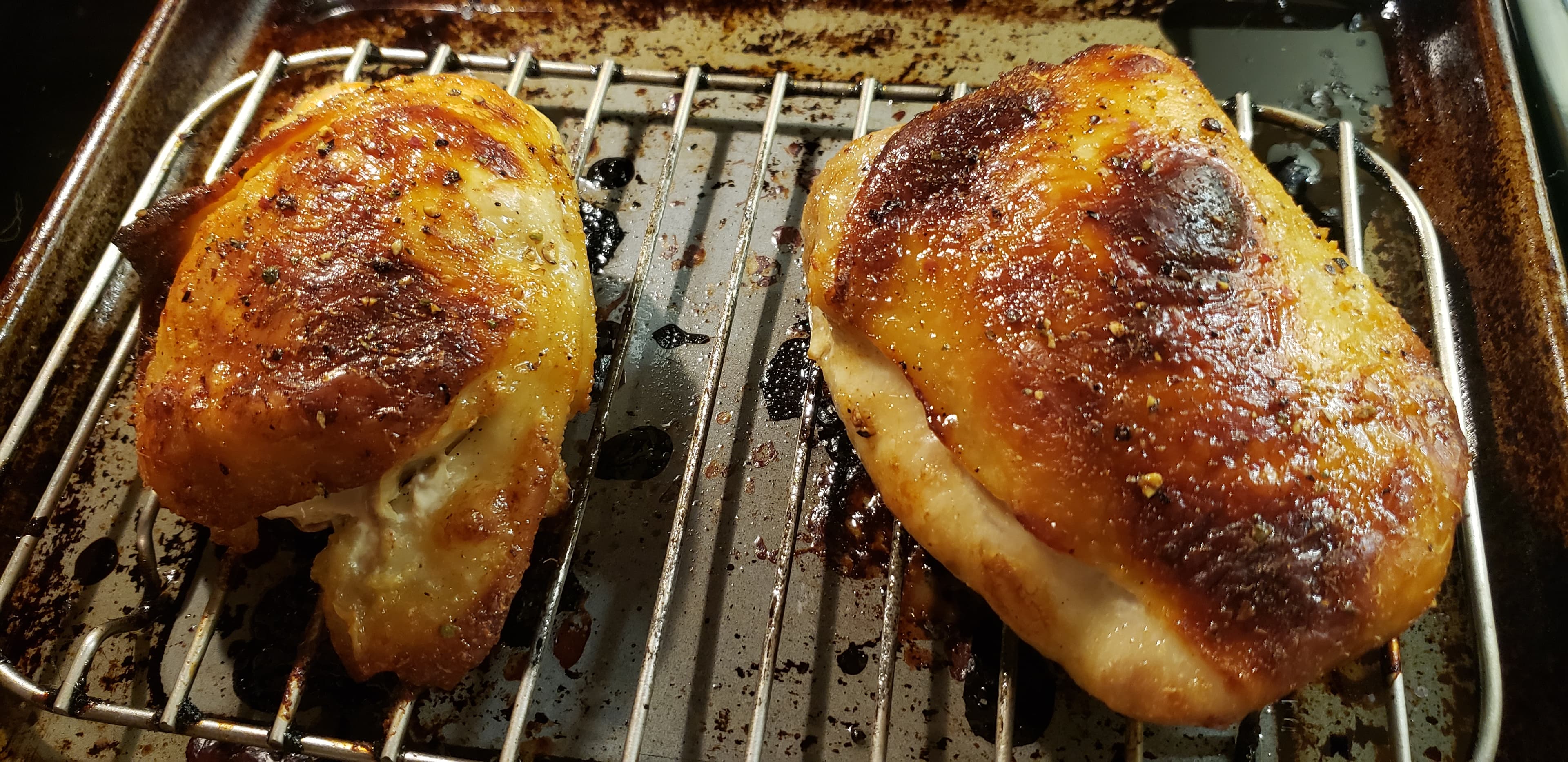 Drained and put on a rack on a baking sheet, and into the convection oven at 385° for about 40 minutes.