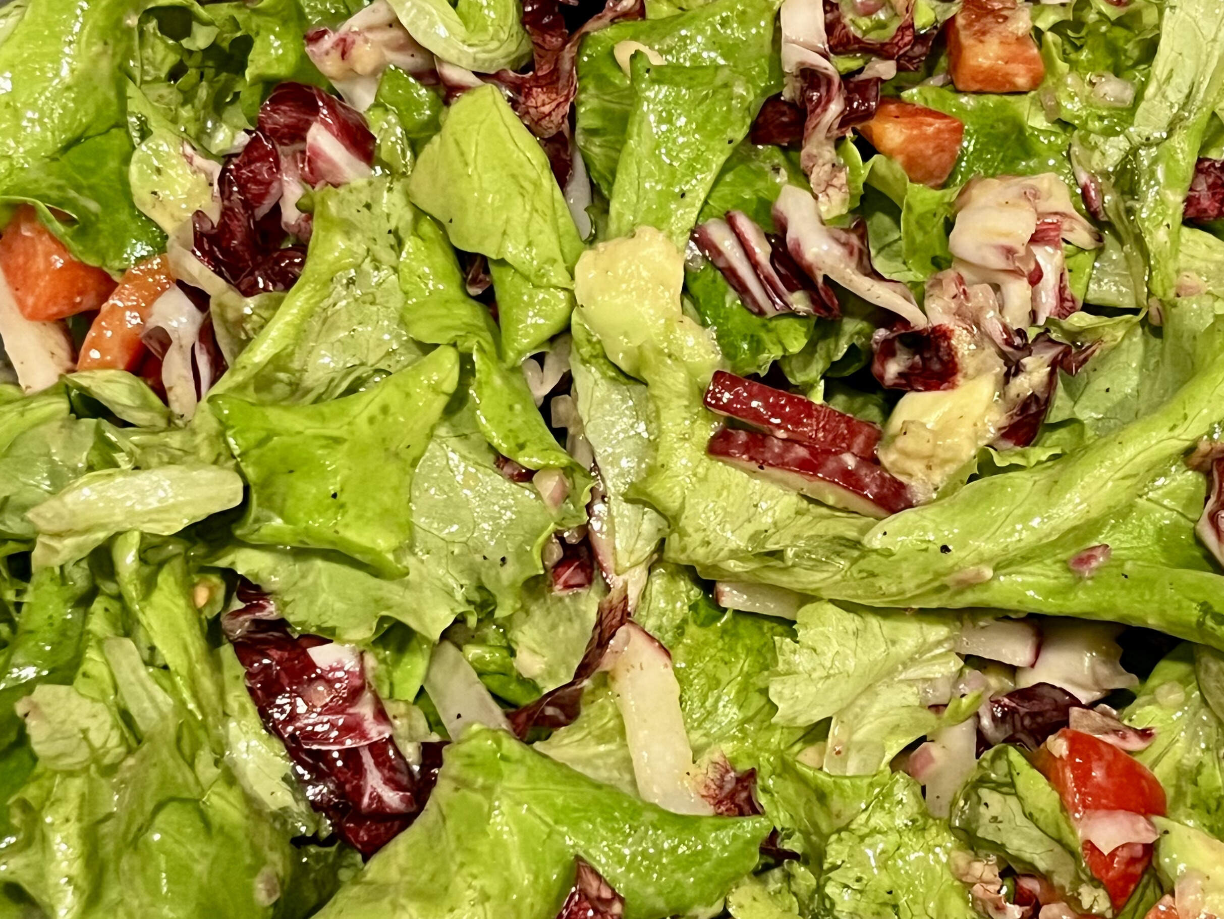 ‘twas mighty tasty. I also made a simple salad with butter lettuce and bits & bobs from the crisper (red pepper, the last fat radish, radicchio, a couple of campari tomatoes, and a perfectly ripe 1/2 avocado) in a sherry mustard vinaigrette.