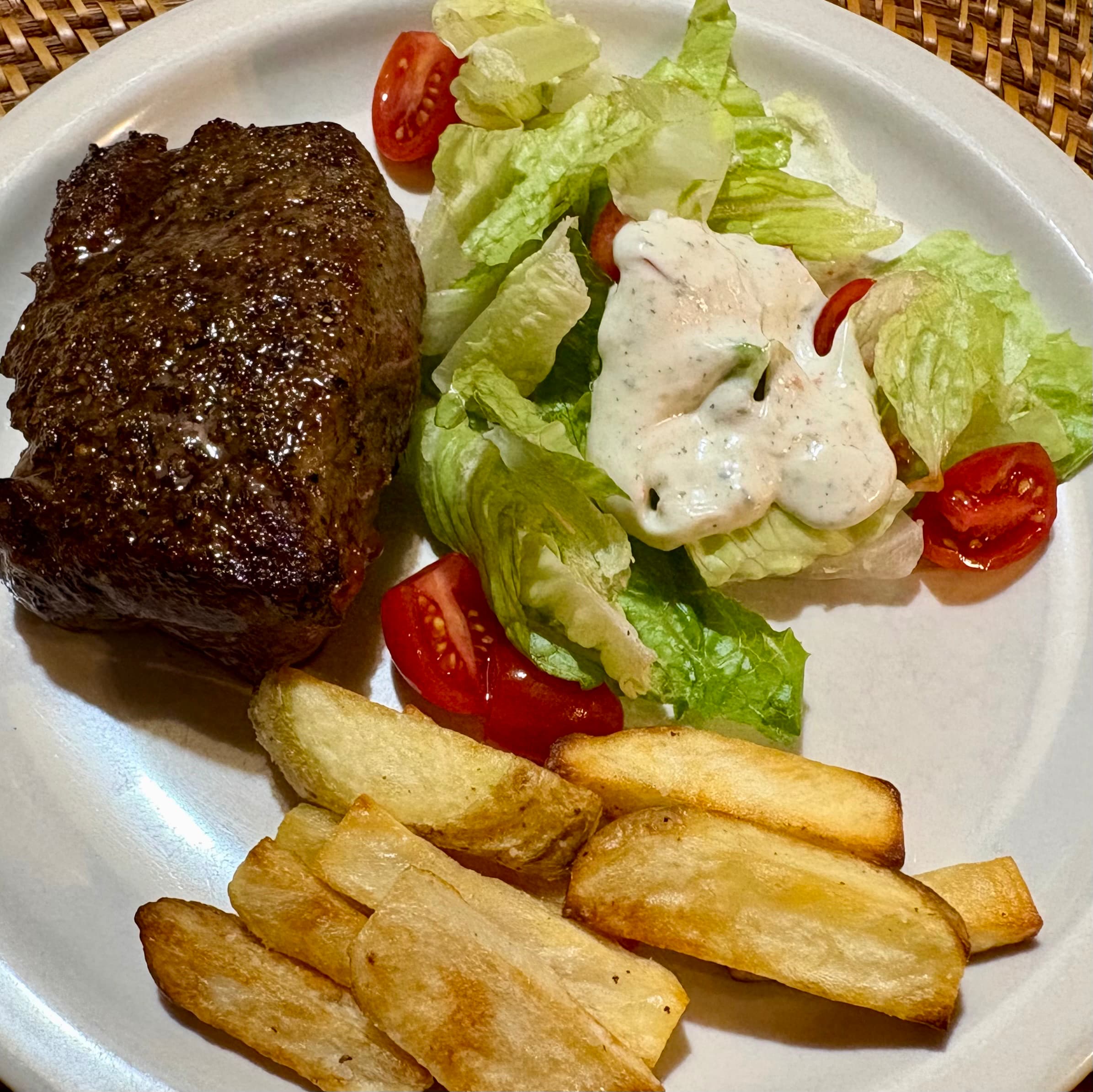 Steak night! Top sirloin served with convection oven fries, and a salad with tomatoes and homemade ranch dressing.