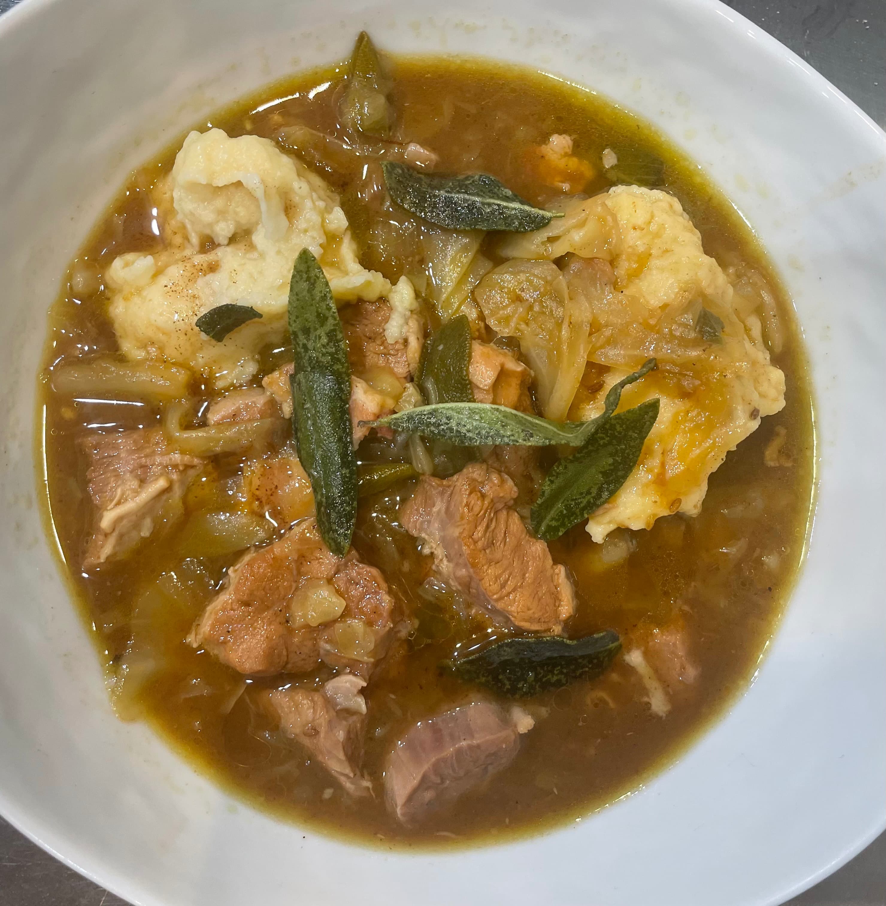 Veal-Cabbage Gulasch with Sage and “Spatzenknoedel” (Flour Dumplings) from an essen & trinken recipe - the veal gulasch is a mix of cubed veal breast, green cabbage, bacon, shallots, garlic, sage, flour, marsala wine, caraway seeds and bay leaves cooked in veal stock. Finished with some lemon zest and juice and a little bit of honey. The spatzenknoedel are dumplings made in franconia by mixing flour, eggs and milk and cooking some balls of the dough in water until they float. The gulasch is topped with some crispy fried sage leaves and a drizzle of the sage butter.